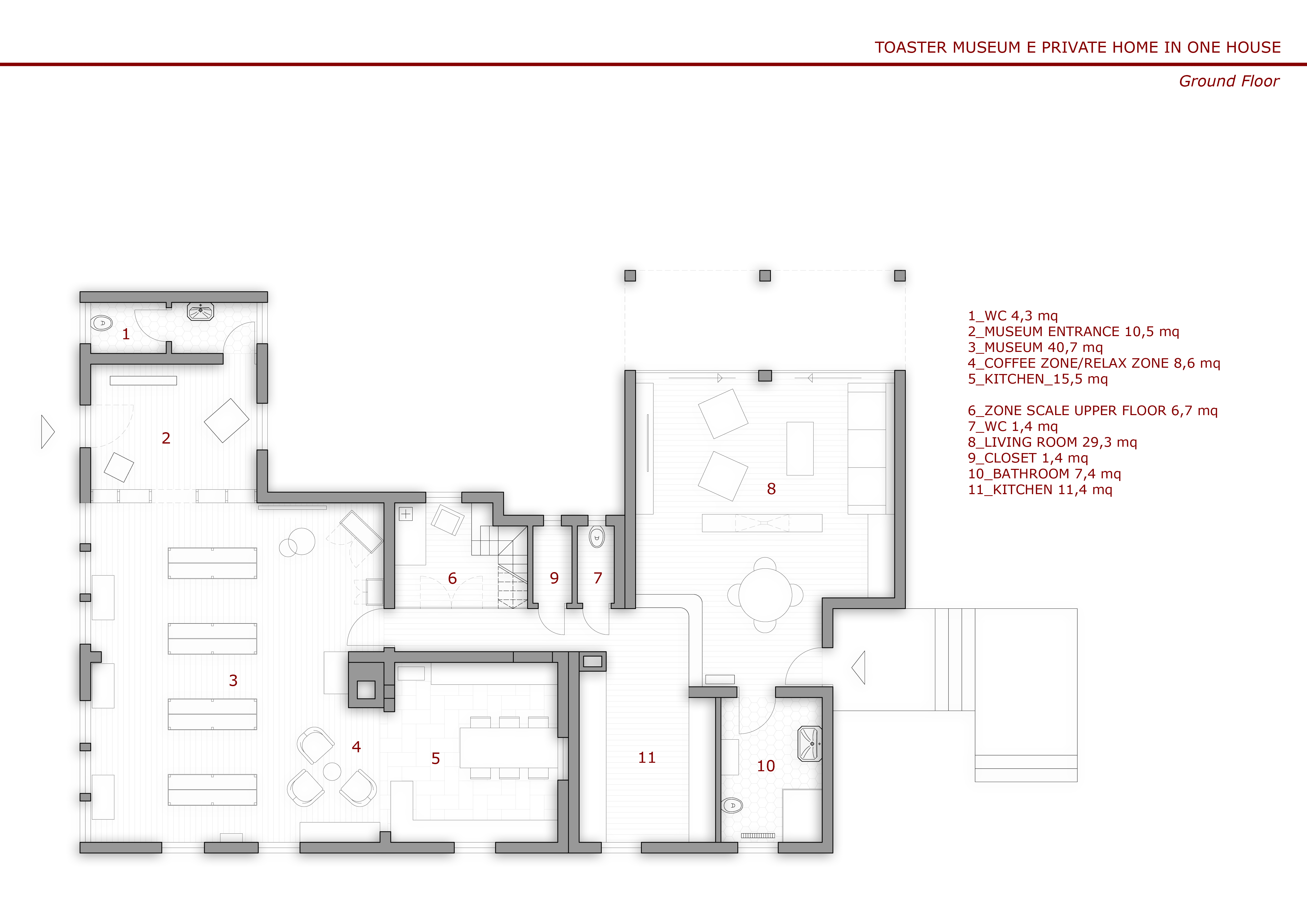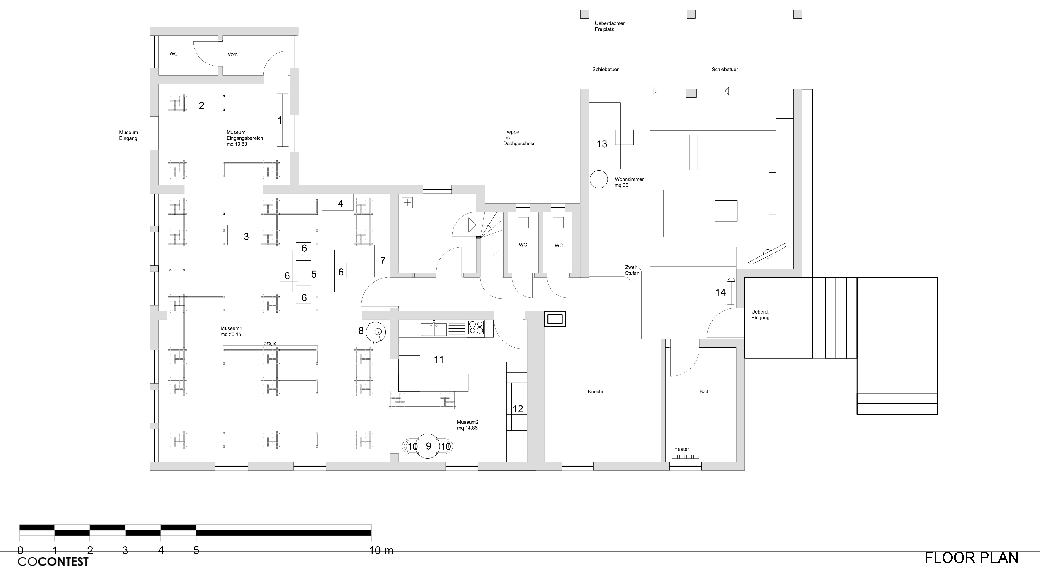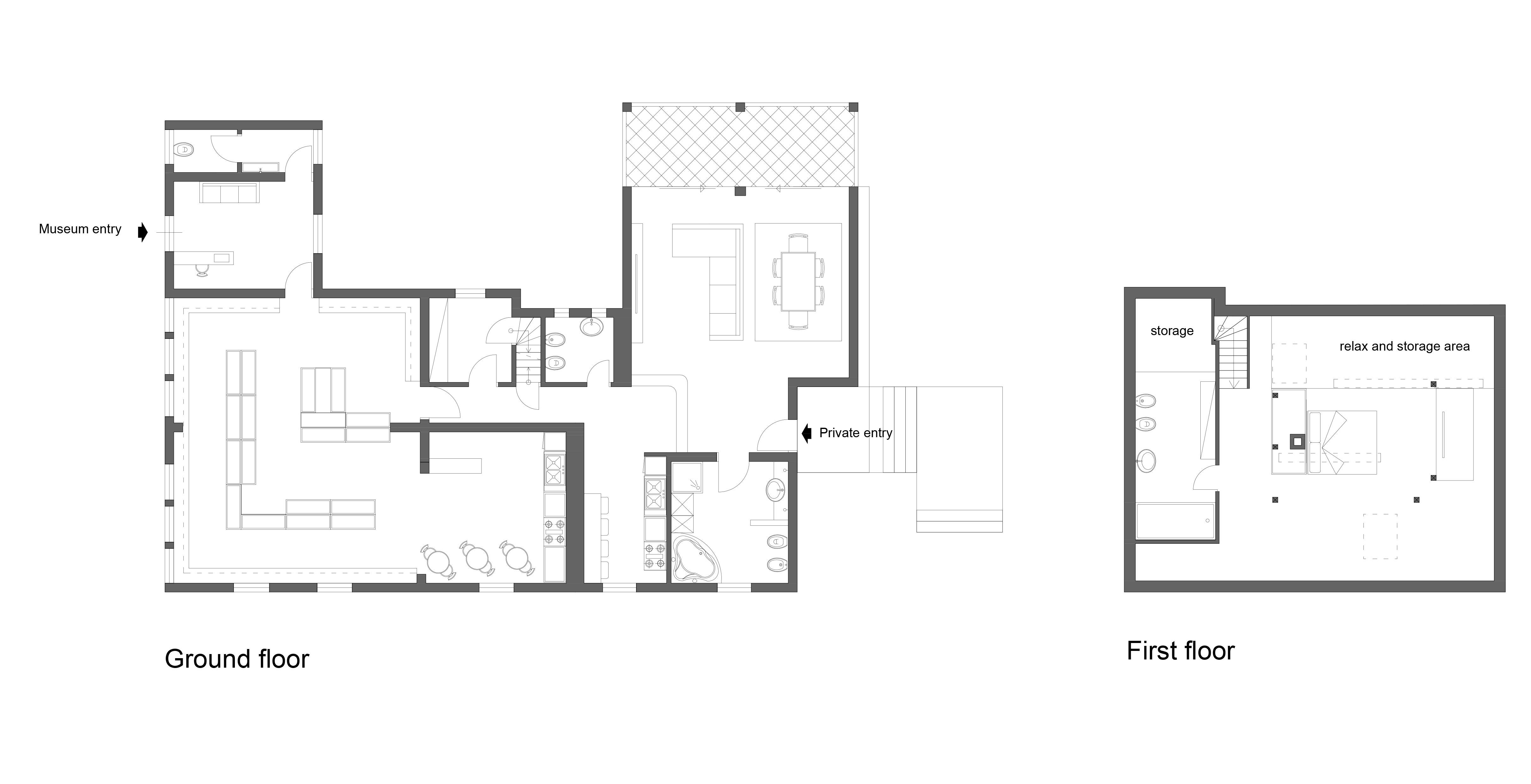 On the first floor there are planned two areas: 1 museum and 2 private (see: floorplan_ground_level_v005). These areas will be connected with one door only. The door of room Museum 2 will be bricked. There is a room called "Museum Eingangsbereich". In this room will be the museum entry (marked in blue letters).