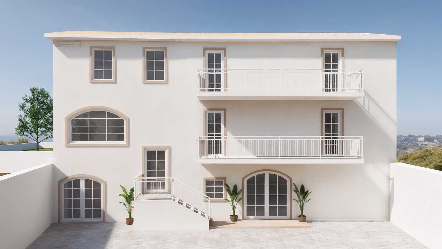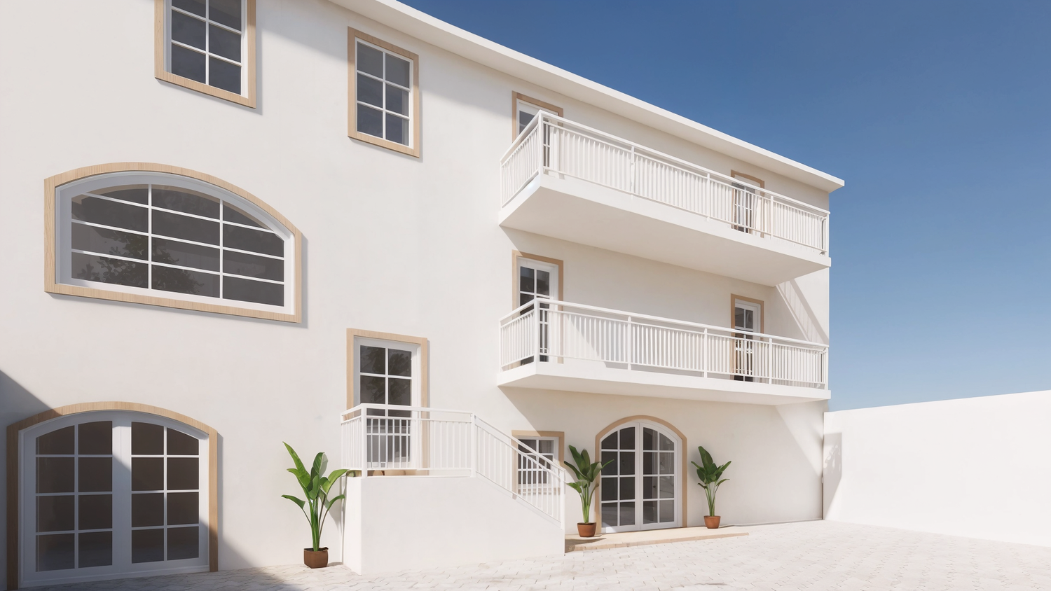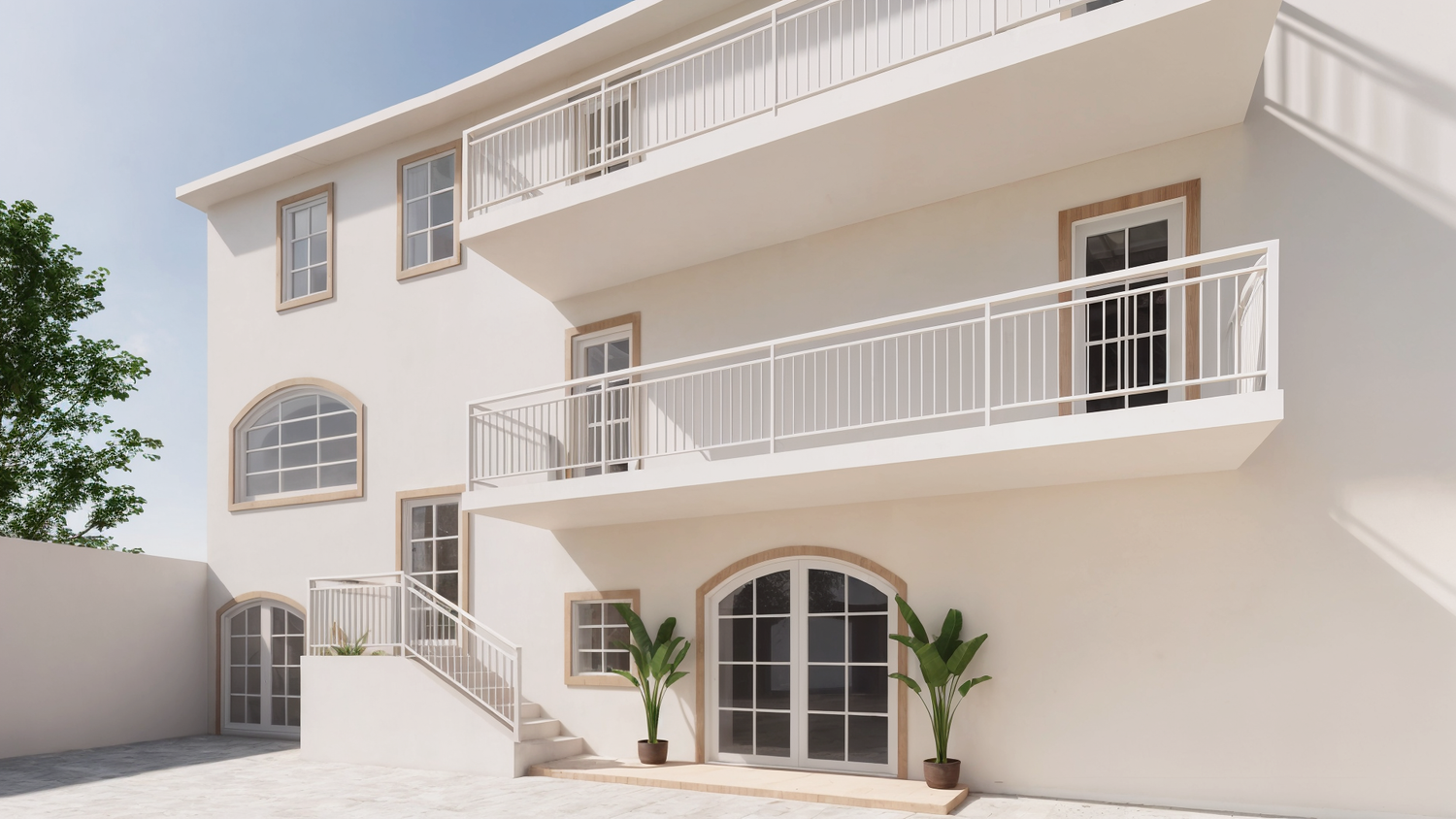 I quattro appartamenti hanno metrature diverse e servizi diversi. Sono inoltre dotati di un ascensore che può essere utilizzato dal piano terra al secondo piano. Il giardino sul retro ospita una piscina e un'area comune per tutti i residenti dell'appartamento.