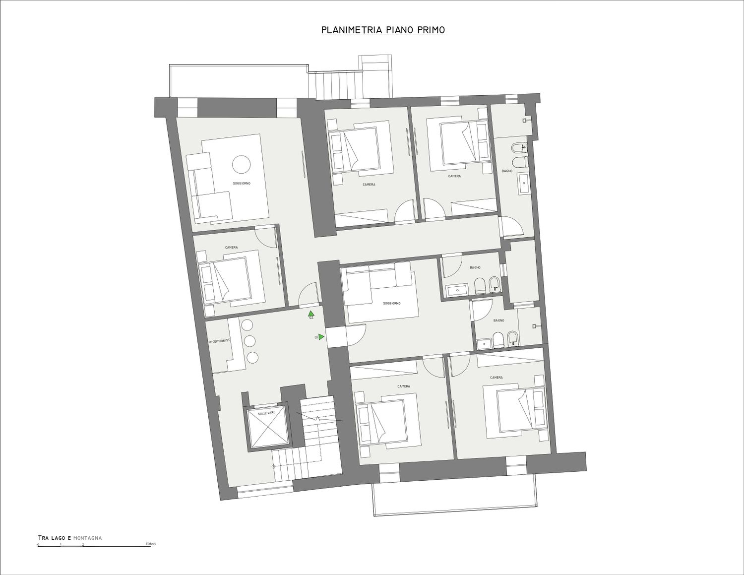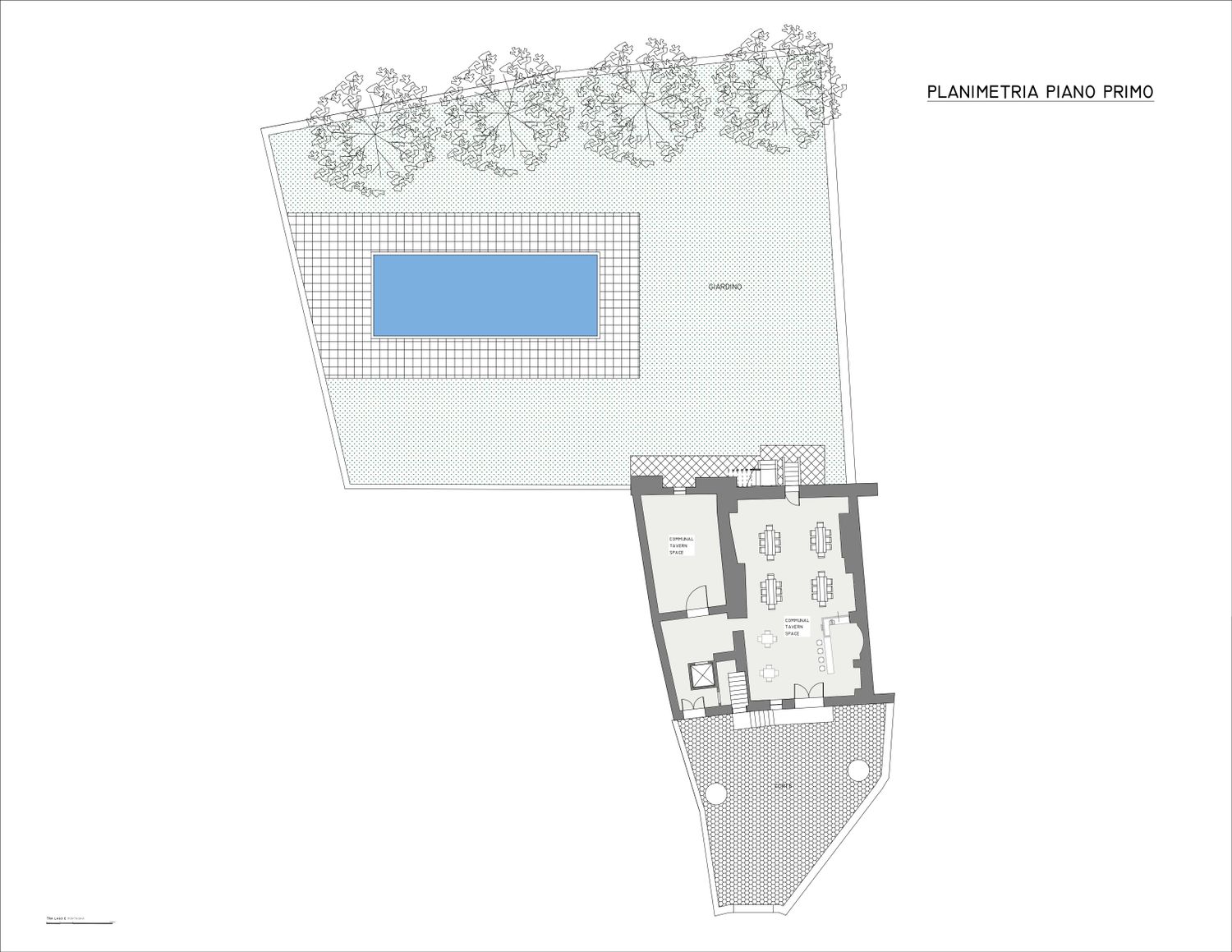 Come da lei descritto, desidera quattro appartamenti con una reception, una taverna comune al piano terra e un giardino sul retro per le aree comuni. Come può vedere, ho suddiviso i quattro spazi in 01, 02, 03 e 04, ognuno con i seguenti servizi: