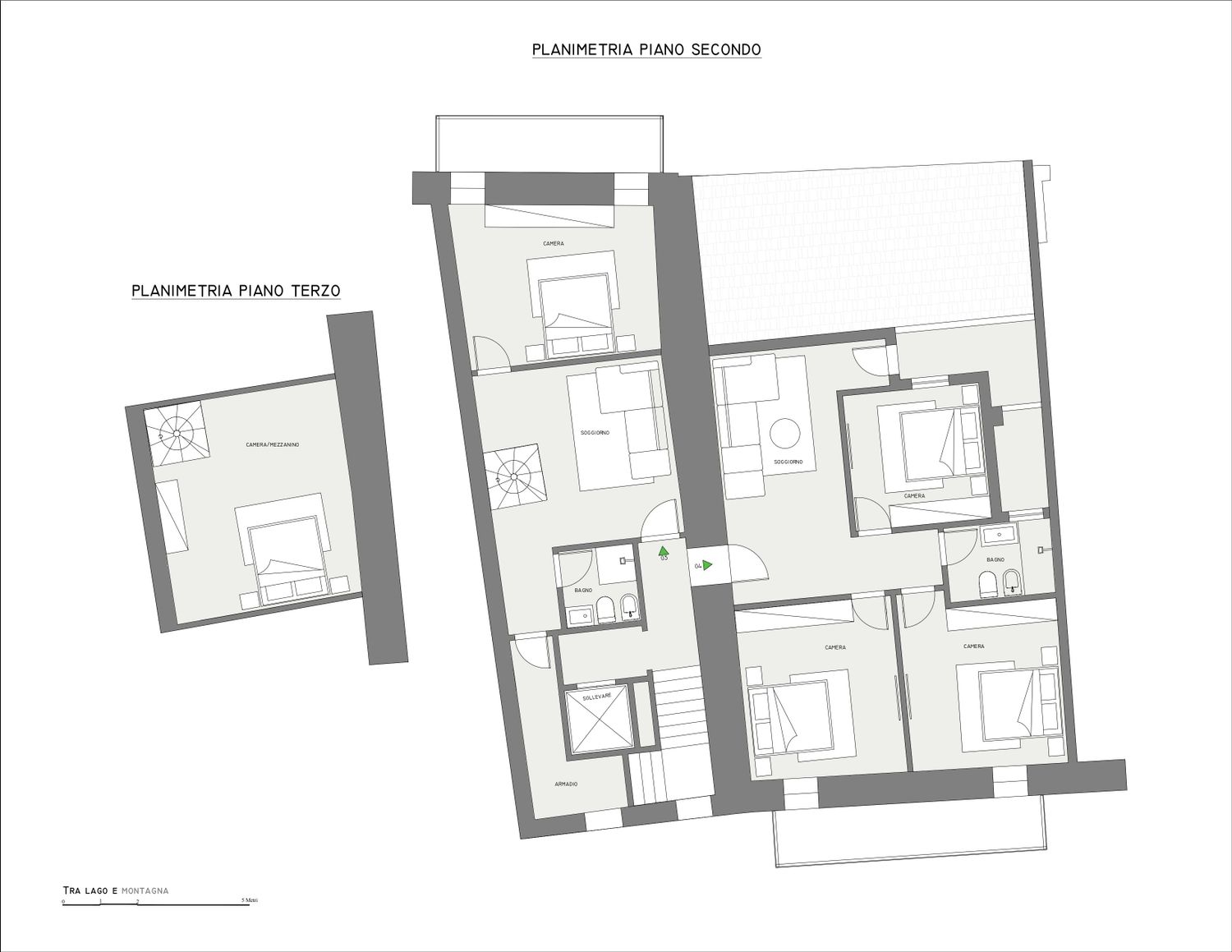 03: Un soggiorno, due camere da letto, una delle quali si trova al terzo piano. Sono inoltre presenti un bagno e un ripostiglio.