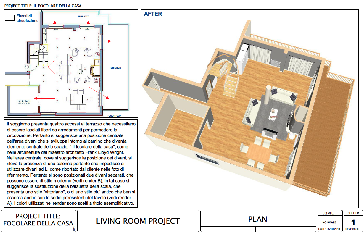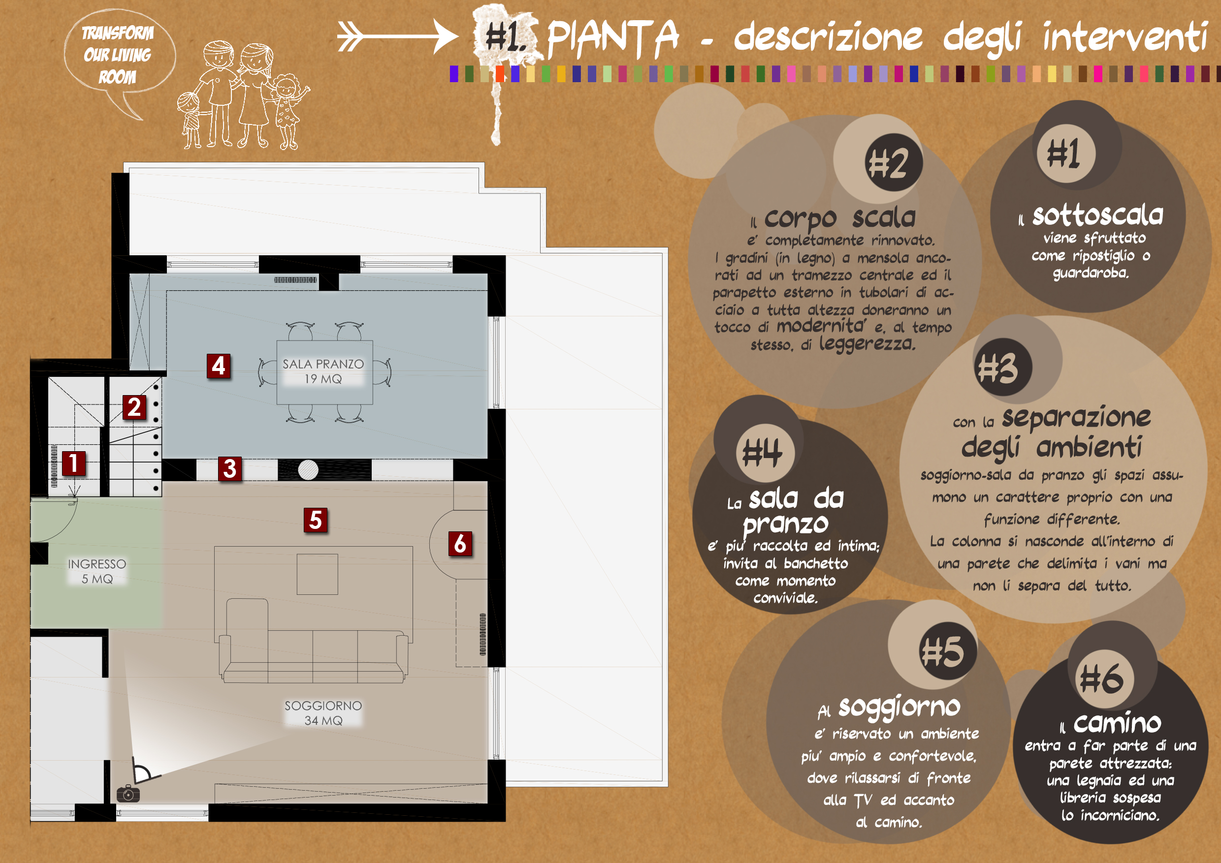 Salve, abbiamo un appartamento si trova al quarto ed ultimo piano di una palazzina e come si vede dalle piantino ha anche di terrazzi.. Siamo interessati ad idee su come arredare solo il soggiorno. La sala è un ampio spazio di circa 70 mq che al momento è arredata con i mobili che erano già in nostro possesso. La sala ha molte finestre ed è molto luminosa (le foto nn rendono questo aspetto perché le abbiamo fatte di sera). Le uniche cose che siamo sicuri di voler tenere sono il camino e la sua posizione (chiaramente il "rivestimento" del camino potrebbe cambiare), il pavimento, i termosifoni (visibili nelle foto) che non volgiamo spostare e la presenza di un tavolo da almeno 6 persone (il nostro ci piace). Il resto, compresa la struttura e lo stile della scala (che non c'e' mai piaciuta) è da pensare.