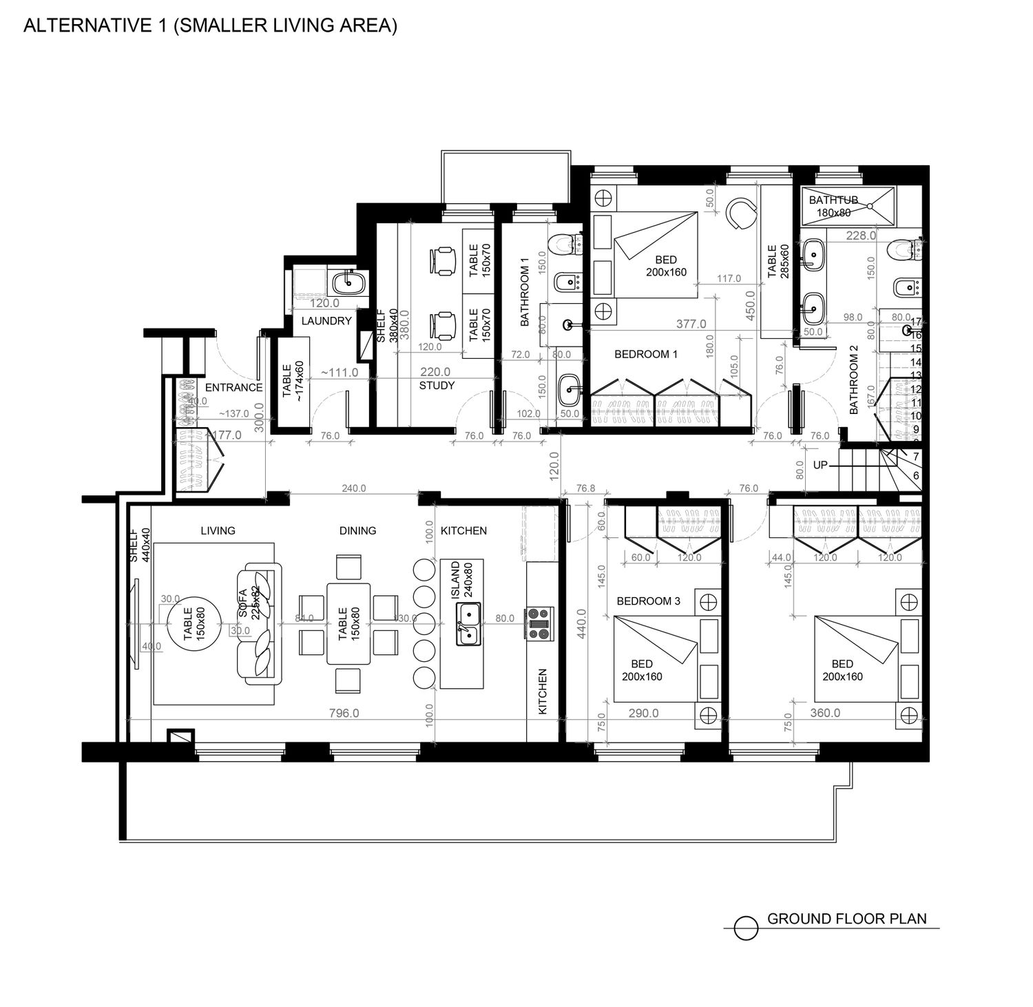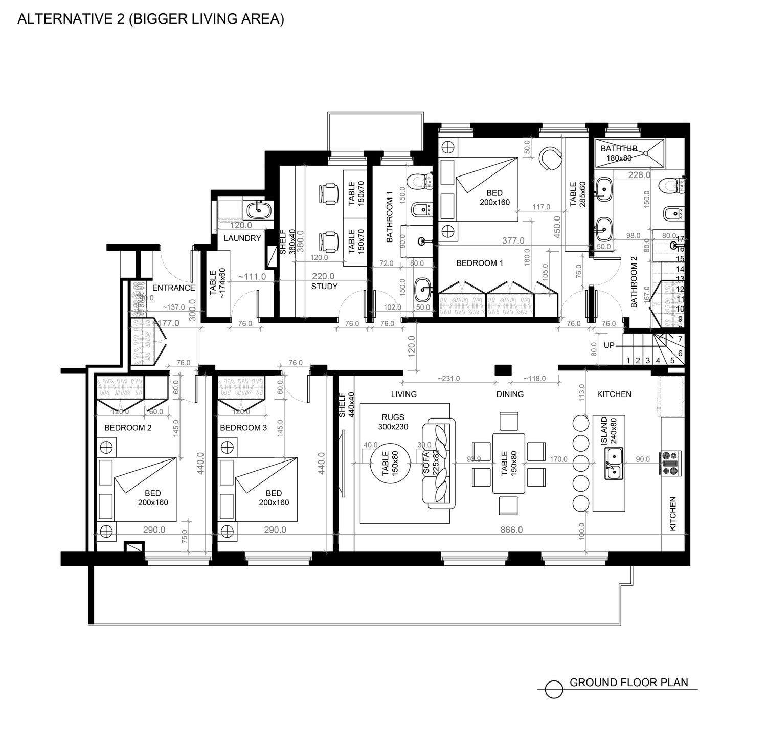 The difference between the two alternatives that I am proposing is in the location of the bedrooms facing the long balcony. In the first alternative I locate the bedrooms near the entrance then you will get larger living area but the position of the bedroom door is right on the entrance which may not be convenient for you. In this alternative, if you would like to use the rooftop as the extension of your living area, the staircase would be conveniently near to it. In the second alternative I locate the bedrooms near the staircase to the rooftop which may be more convenient regarding the closure of the bedroom doors and its proximity to the bathrooms but you will get smaller living area due to the positions of the windows.