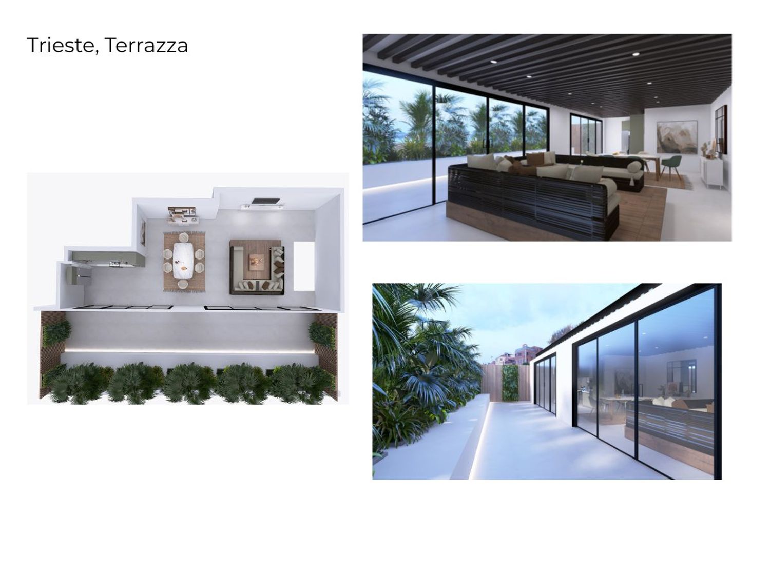 La terrazza è concepita come un vero e proprio spazio living outdoor, progettato per essere fruibile durante tutto l’anno. La copertura è affidata a un tetto bioclimatico con struttura in alluminio e lamelle orientabili, richiudibile nei mesi invernali e apribile durante la stagione estiva per garantire comfort, ventilazione naturale e controllo dell’irraggiamento solare.