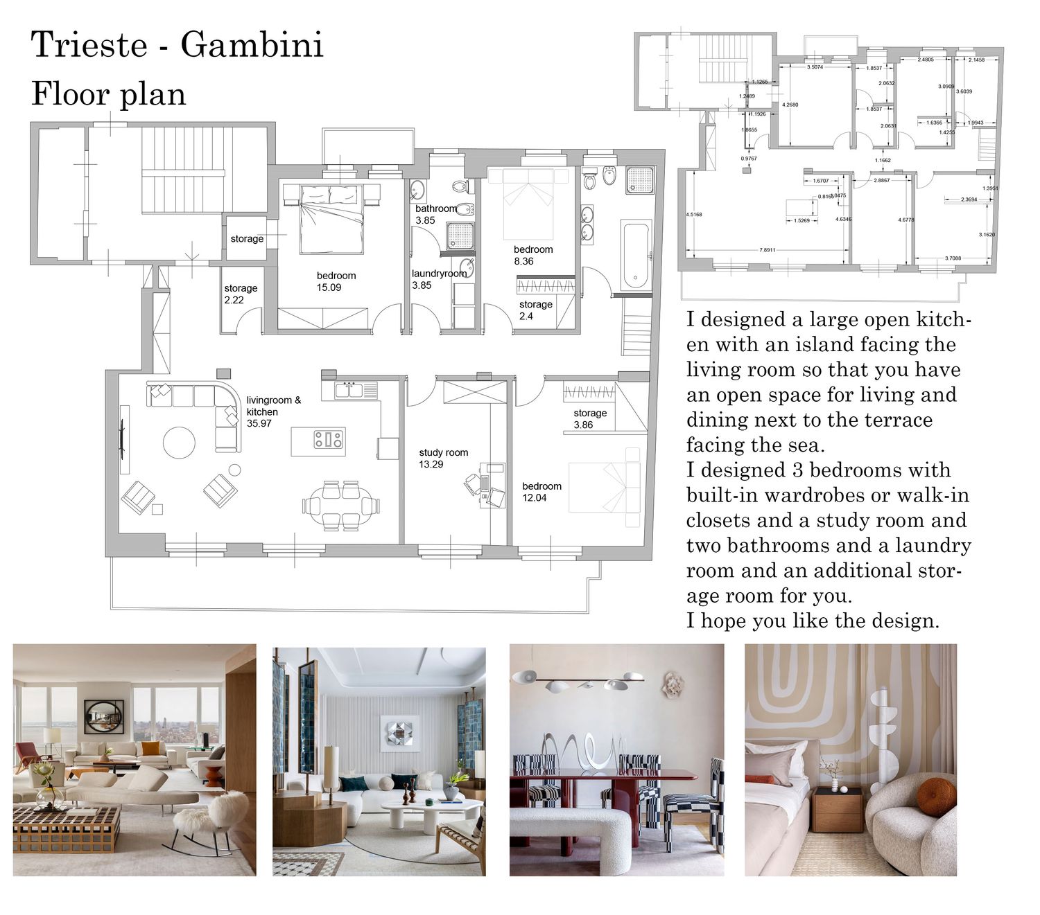 I designed 3 bedrooms with built-in wardrobes or walk-in closets and a study room and two bathrooms and a laundry room and an additional storage room for you.
