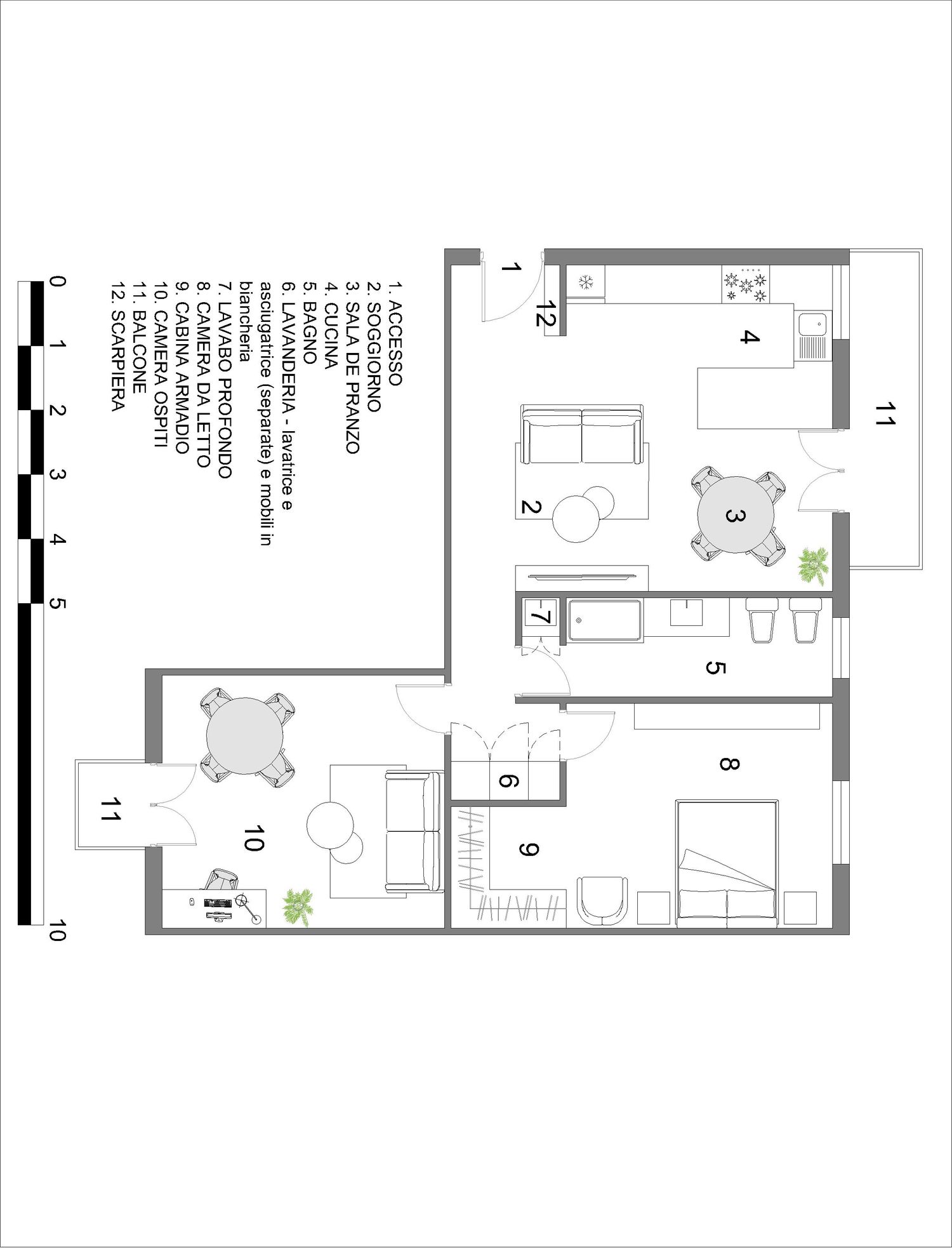 Proponiamo una cucina/soggiorno open space, una piccola lavanderia separata dalle altre stanze e uno spogliatoio in camera da letto.
