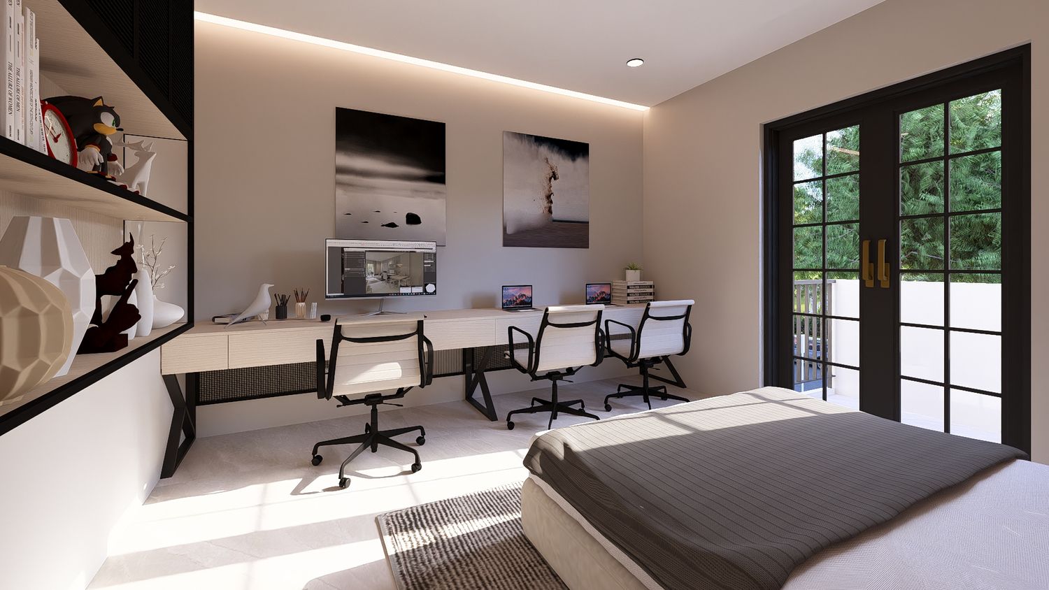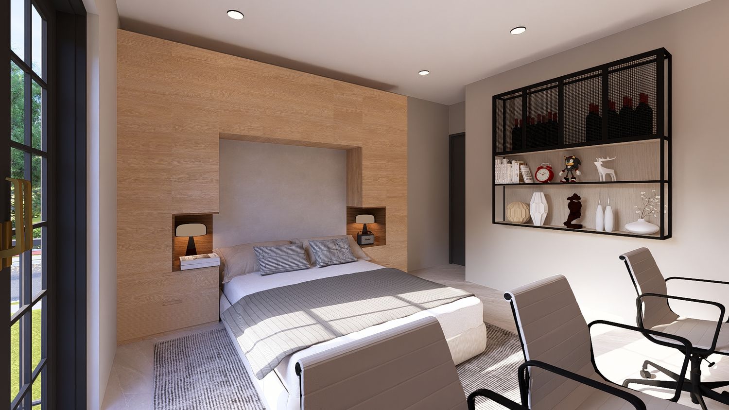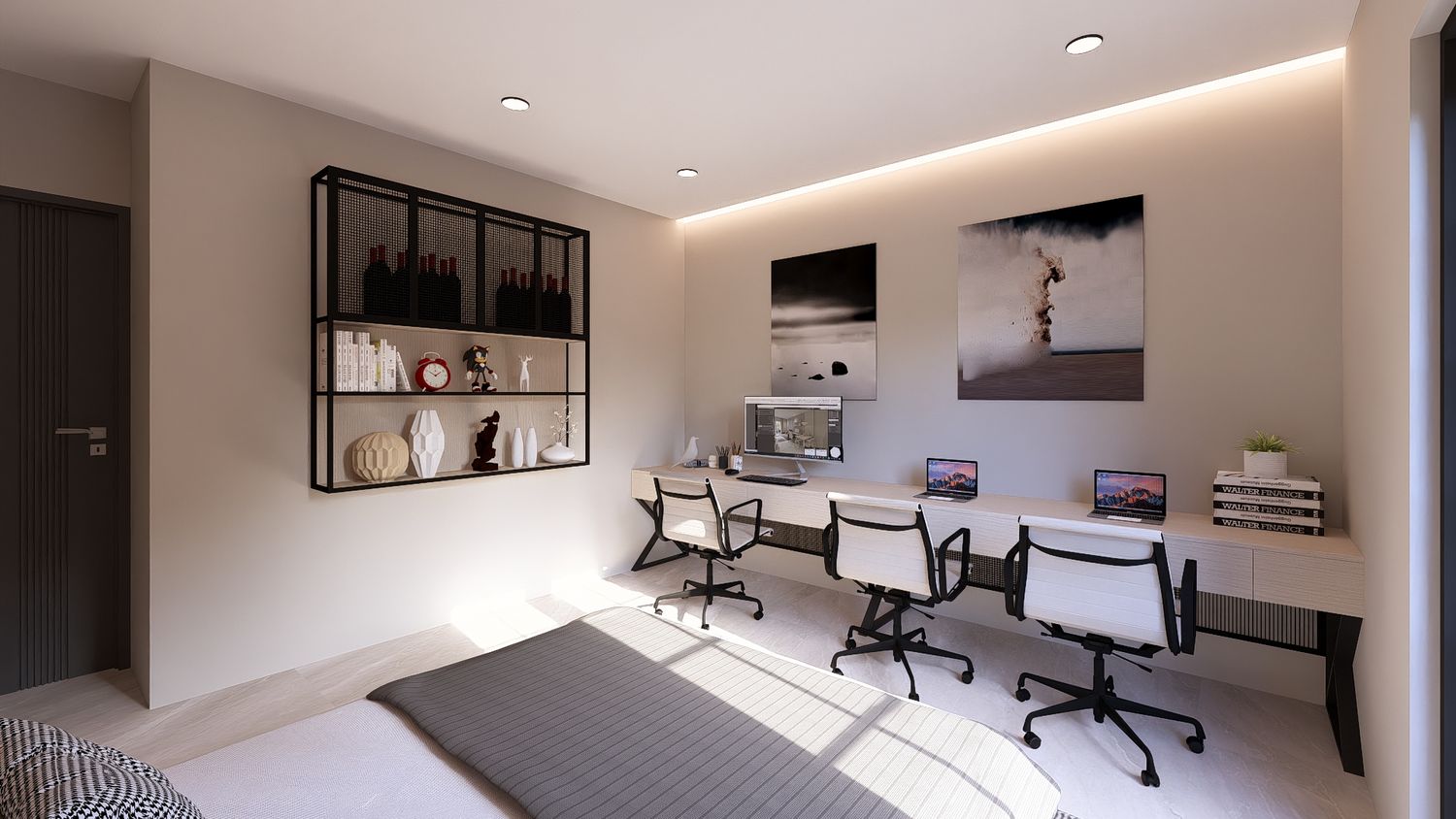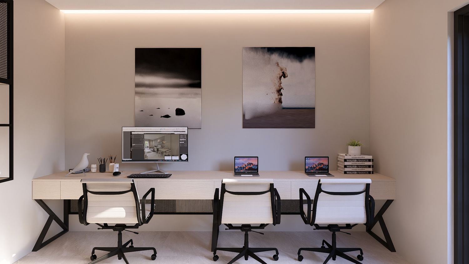 Questa soluzione privilegia comfort e separazione degli ambienti, con uno studio indipendente che può essere utilizzato come stanza multifunzionale (lavoro, ospiti o relax).