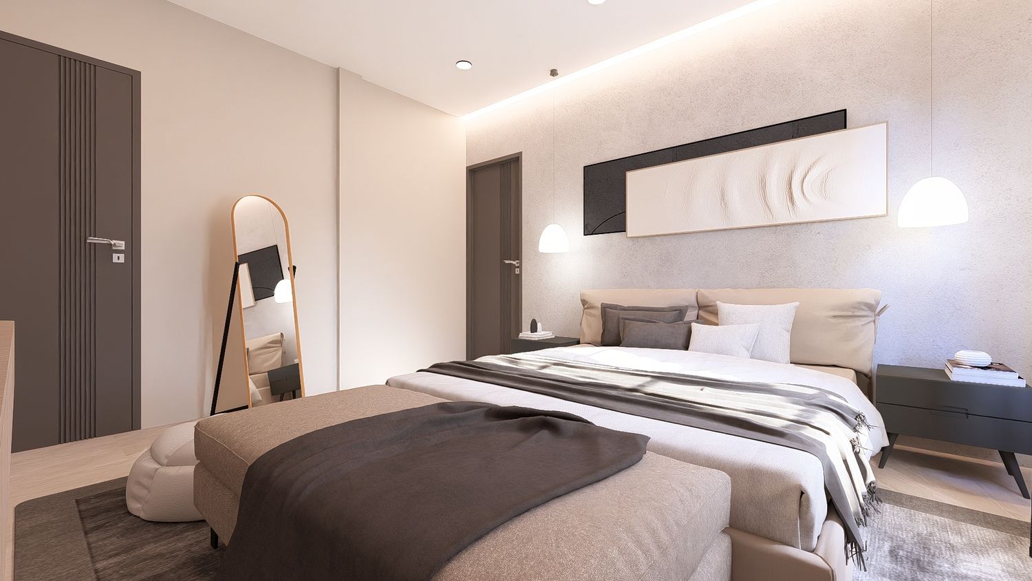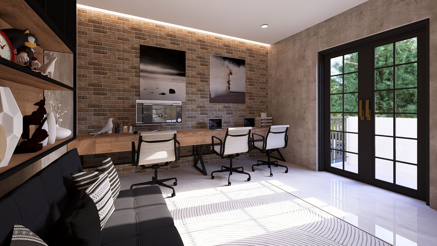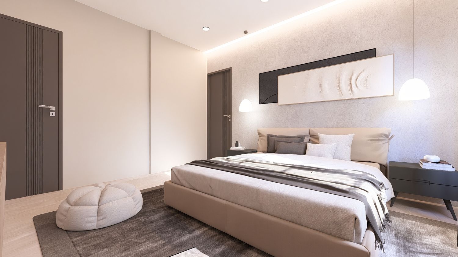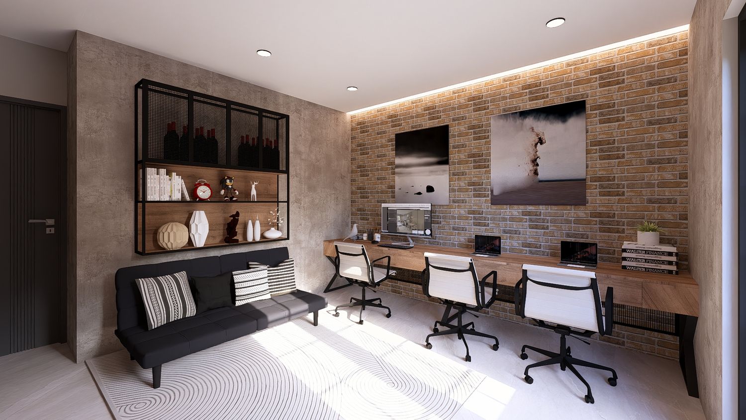 Questa soluzione privilegia comfort e separazione degli ambienti, con uno studio indipendente che può essere utilizzato come stanza multifunzionale (lavoro, ospiti o relax).
