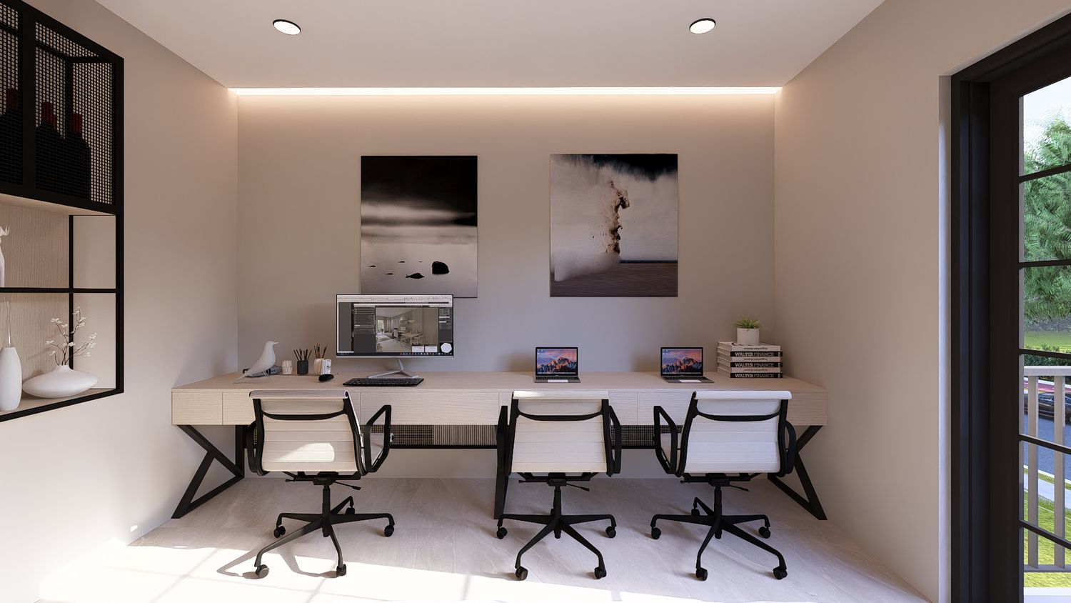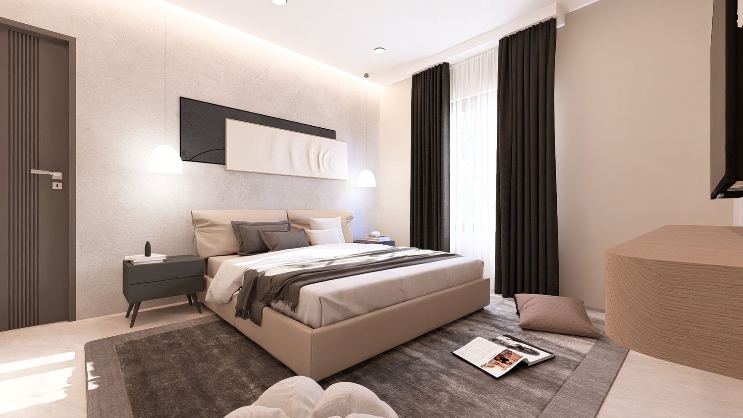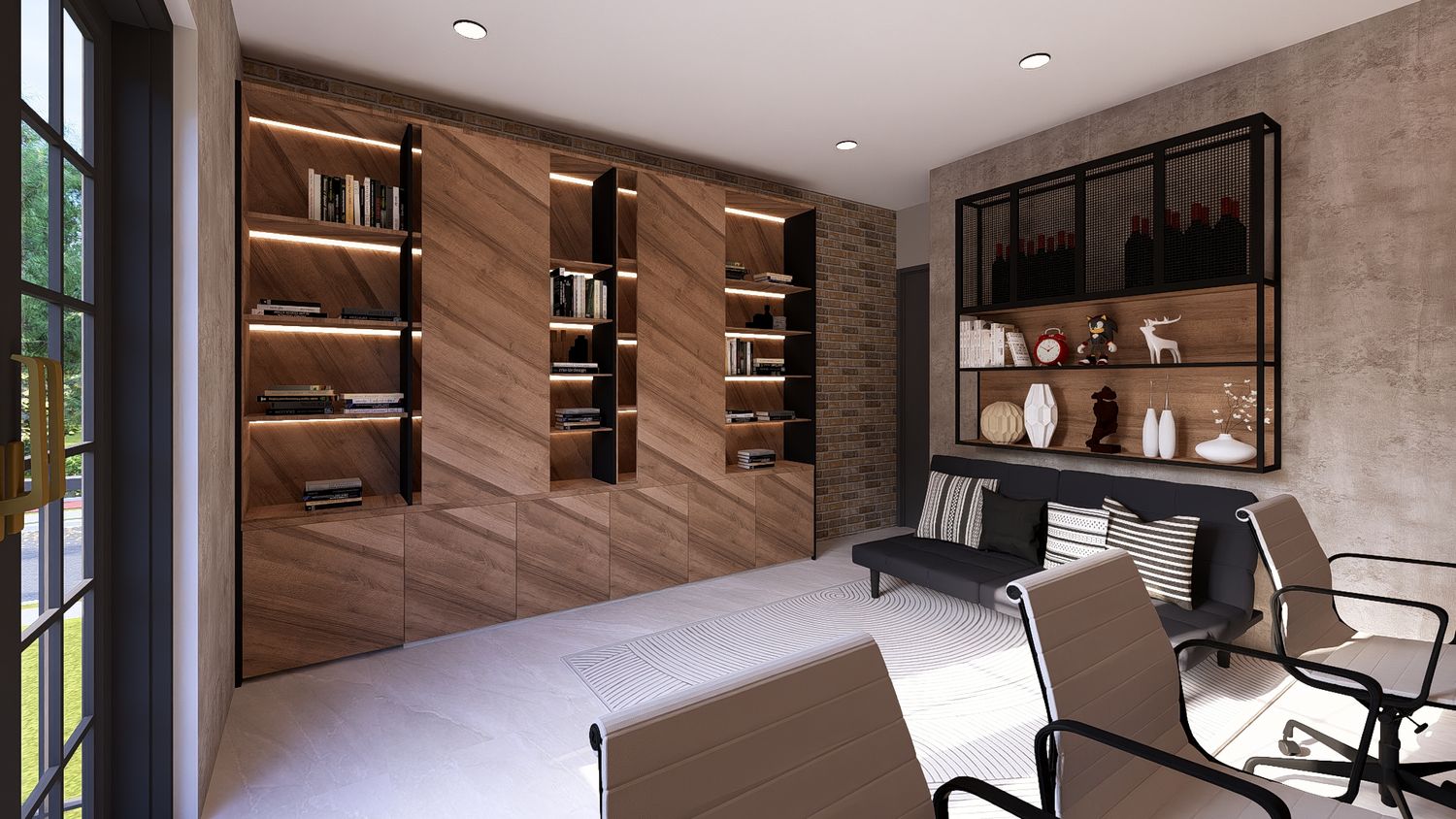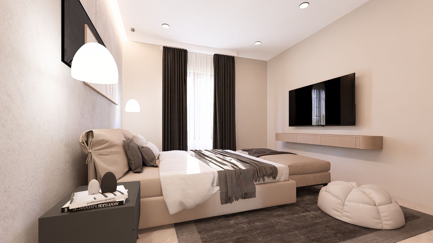 Questa soluzione privilegia comfort e separazione degli ambienti, con uno studio indipendente che può essere utilizzato come stanza multifunzionale (lavoro, ospiti o relax).