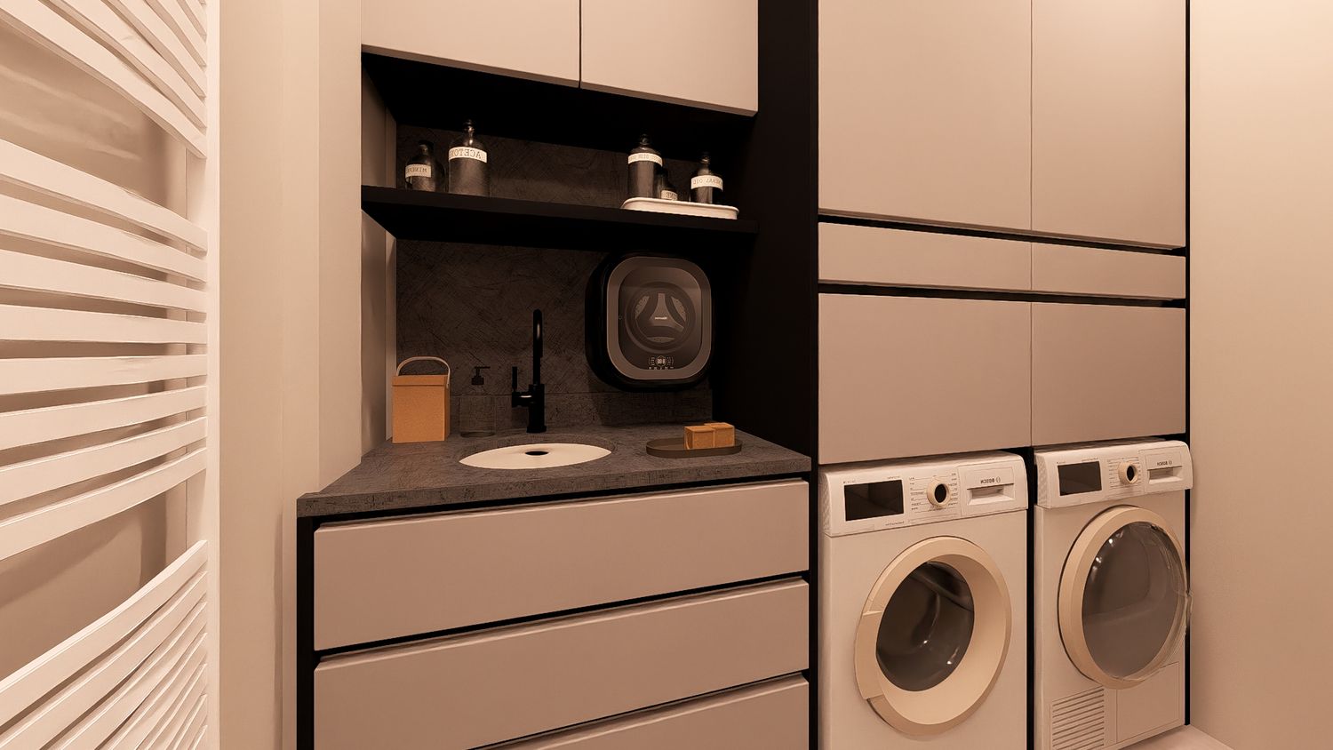 Permette una maggiore ottimizzazione della superficie senza rinunciare alla qualità degli spazi principali, mantenendo la zona giorno ampia, la lavanderia dedicata e la zona notte tranquilla.