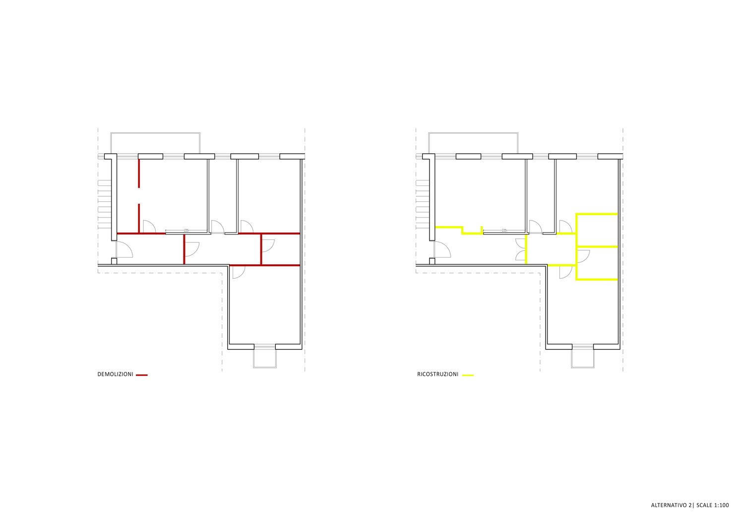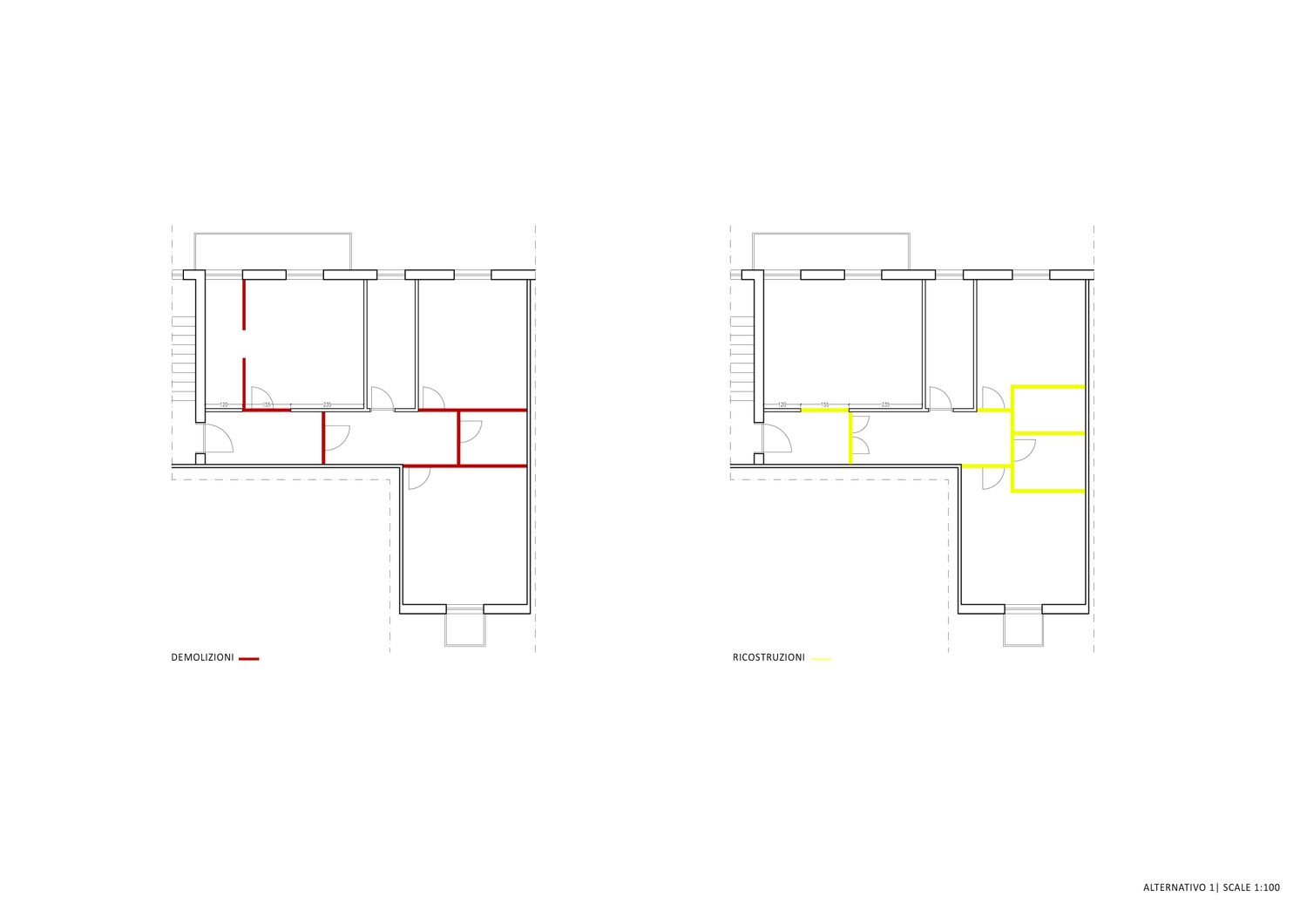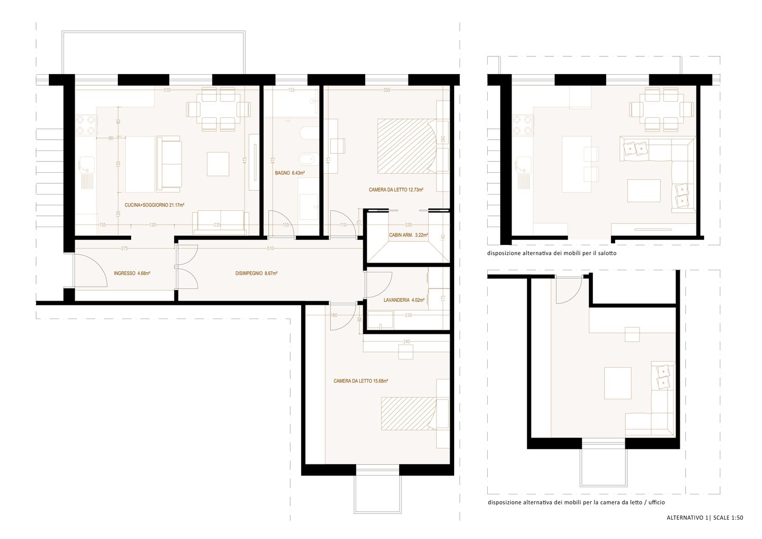 Sulla base dei dati forniti nel brief di progetto, è stato sviluppato un concept distributivo con l’obiettivo di garantire un utilizzo integrato e il massimo livello di efficienza dello spazio soggiorno con cucina a vista. In conformità alla Vostra richiesta, la posizione esistente del bagno è stata mantenuta, mentre l’organizzazione interna e la disposizione dei sanitari sono state riorganizzate.