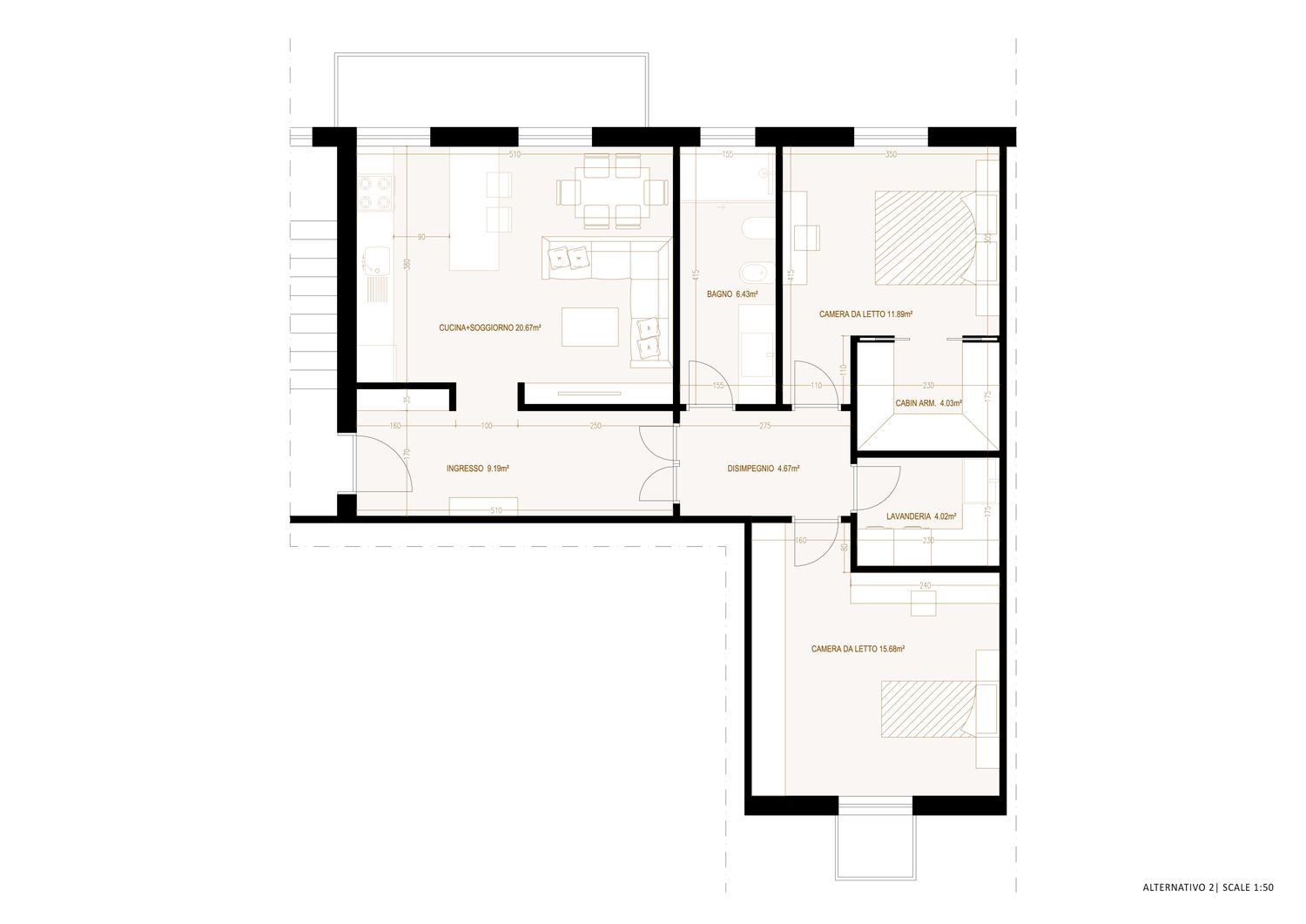 A causa della larghezza netta del bagno pari a 1,54 m, è stata prevista una doccia walk-in con porta scorrevole posizionata davanti alla finestra. Lo spazio rimanente è stato progettato per accogliere in modo confortevole ed ergonomico il lavabo e la configurazione WC–bidet.All’interno della camera da letto è stata realizzata un cabin armadio, mentre è stato progettato un locale lavanderia separato, con accesso diretto dal corridoio. La lavanderia è dotata di un lavabo sufficientemente grande da poter lavare un animale domestico di medie dimensioni, di armadi per uno spazio di stoccaggio adeguato e di attrezzature per il lavaggio. Al fine di massimizzare l’efficienza dello spazio di contenimento, si raccomanda la disposizione verticale di lavatrice e asciugatrice in colonna; tuttavia, in base alle Vostre preferenze, è possibile anche una configurazione affiancata. La profondità di 80 cm destinata alla lavanderia definisce l’ingresso della zona camera secondaria / studio, mentre lo spazio restante presenta dimensioni adeguate per accogliere diverse soluzioni di arredo.L’impostazione generale del progetto privilegia una distribuzione chiara e funzionale, evitando rientranze e sporgenze non necessarie lungo il corridoio e riducendo al minimo le perdite di superficie.