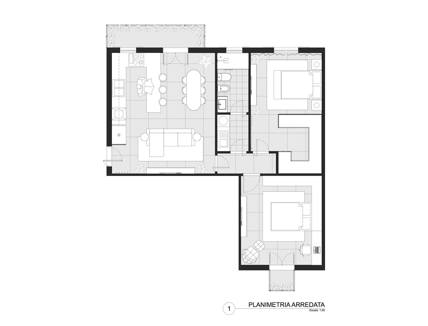 Il risultato è un appartamento con ambienti ampi, circolazione efficiente e spazi accoglienti, che combinano estetica, praticità e comfort.