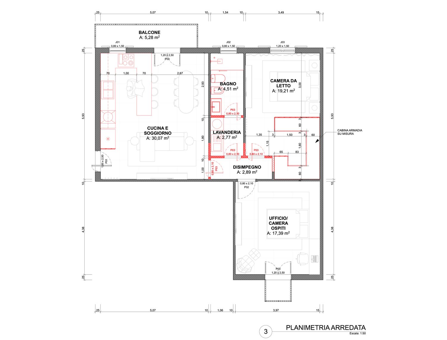 Il progetto adotta un approccio conservativo, sfruttando i punti acqua e gas esistenti per ottimizzare costi e realizzazione. La proposta prevede mobili su misura in cucina, lavanderia e cabina armadio, garantendo il massimo utilizzo dello spazio disponibile. L’organizzazione degli ambienti privilegia funzionalità e comfort, con particolare attenzione all’open space integrato cucina/soggiorno, alla lavanderia separata con lavabo profondo e alla cabina armadio nella camera da letto.
