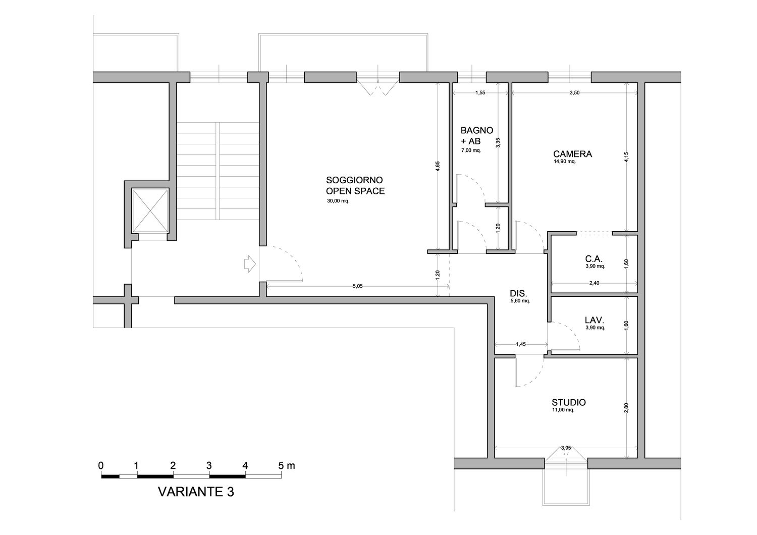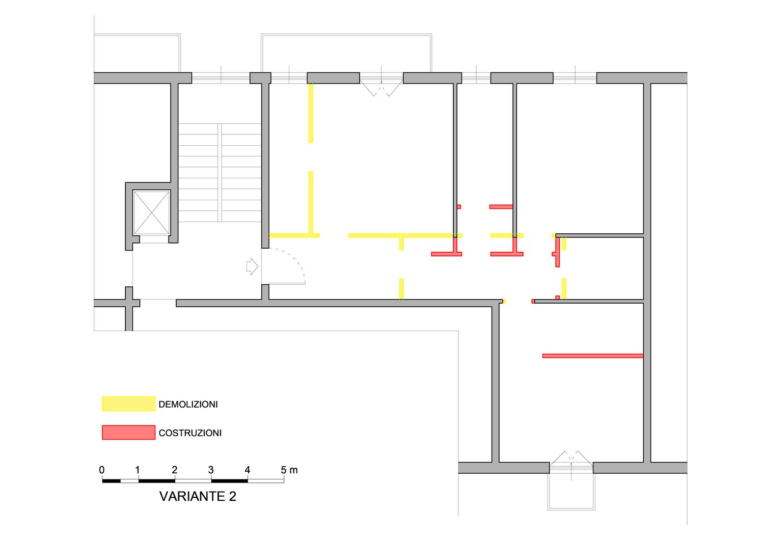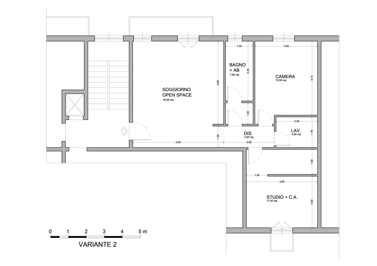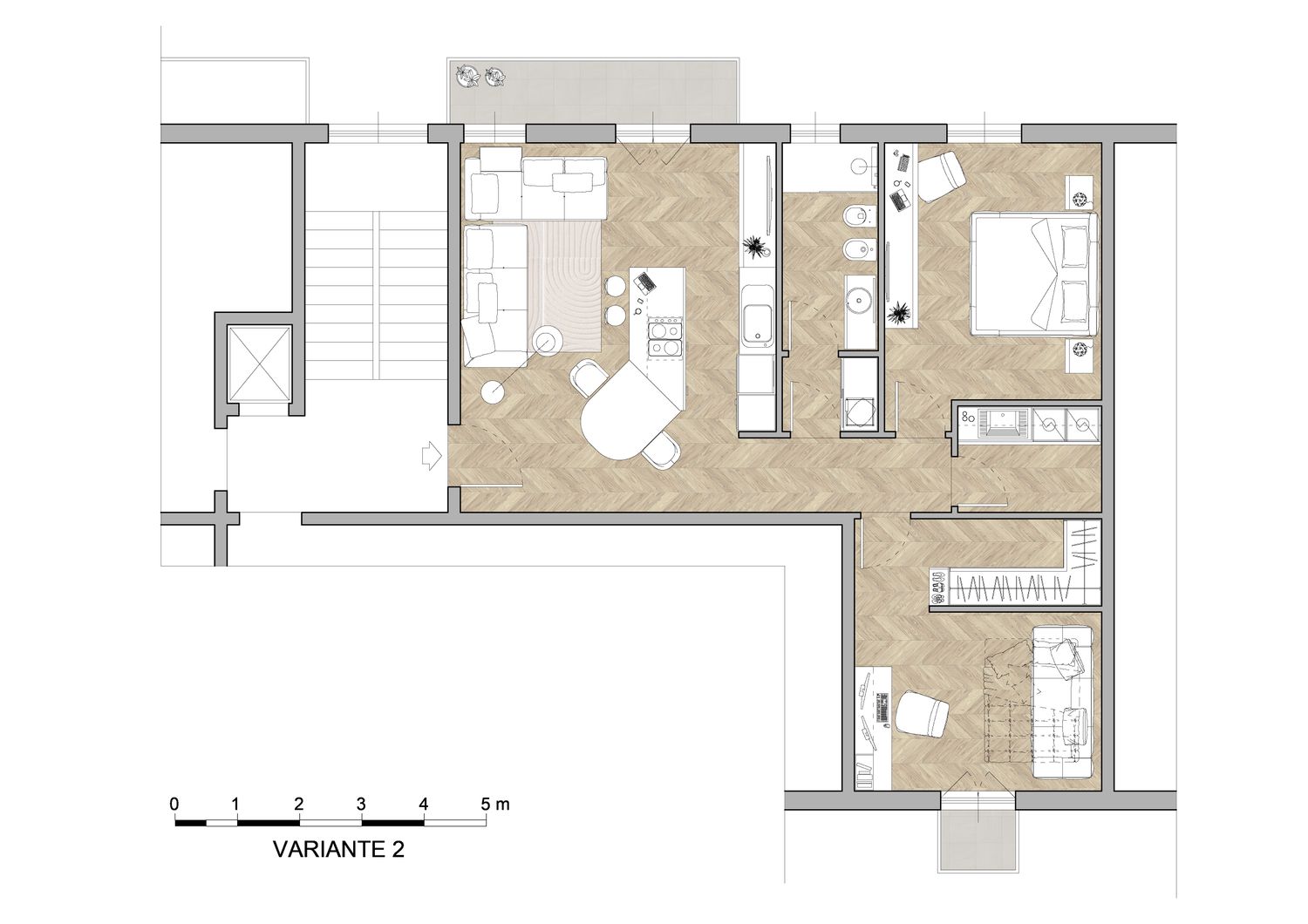 2. Prevede la stessa creazione di open space e la stessa riduzione del disimpegno; la cucina sarà invece con isola e tavolo integrato, nell'antibagno troverà posto un piccolo ripostiglio, la lavanderia sarà più ampia, dotata di armadio per lavatrice e asciugatrice affiancate e lavabo (per panni e per lavare il cane), e creata al posto dell'odierno ripostiglio. La camera/studio conterrà una cabina armadio passante.