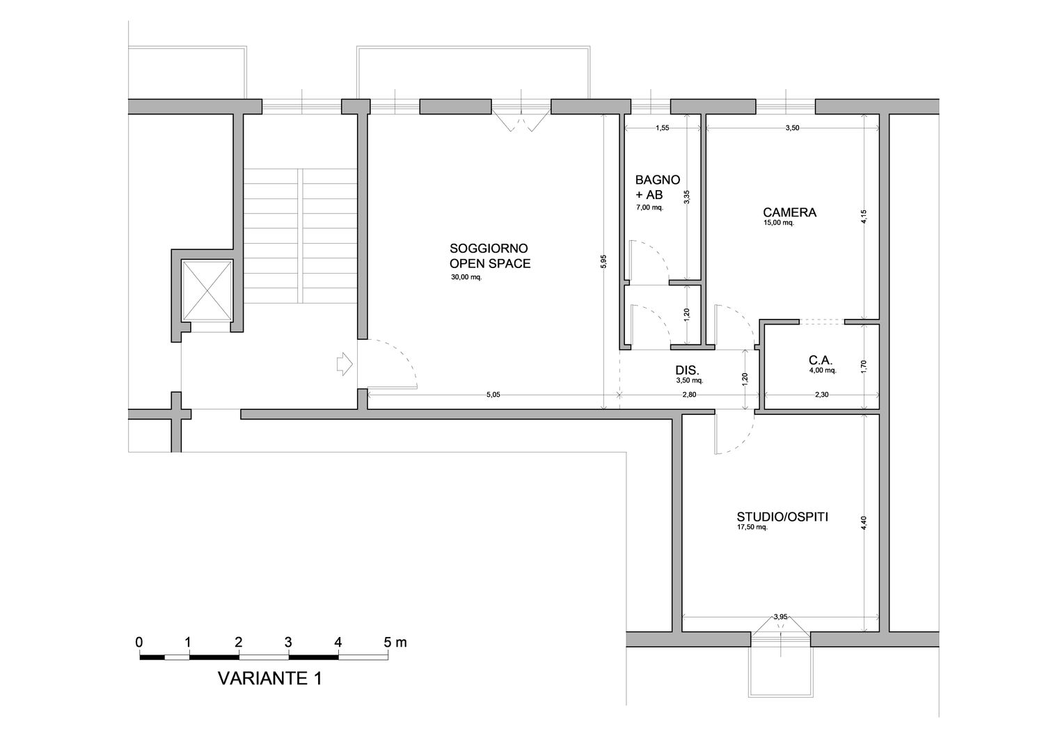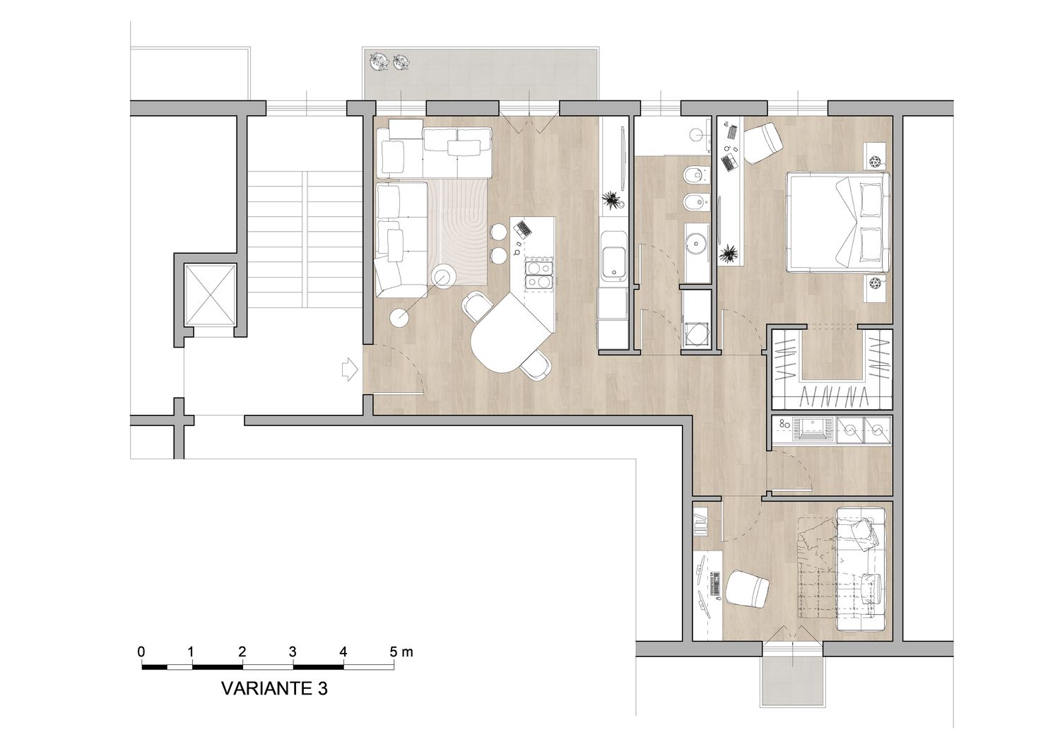 1. Prevede la creazione di un open space con soggiorno, area pranzo e cucina a penisola, una leggera riduzione del disimpegno/corridoio in favore del bagno e della camera da letto; il locale lavanderia è compatto e creato come antibagno, mentre il ripostiglio diventa una pratica cabina armadio. La stanza rivolta sulla strada diventa ampio studio/camera ospiti, arredato con una parete attrezzata con scrivania e divano letto.