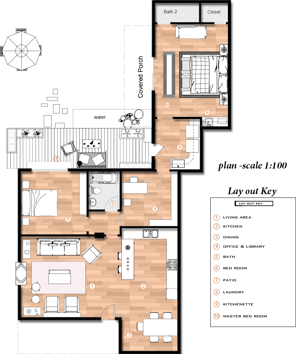This place will should be a quite space surrounded by planters for tranquility and meditation, and even to do morning Yoga. The fire pit can function as gather space on the yard side for when guest are over.