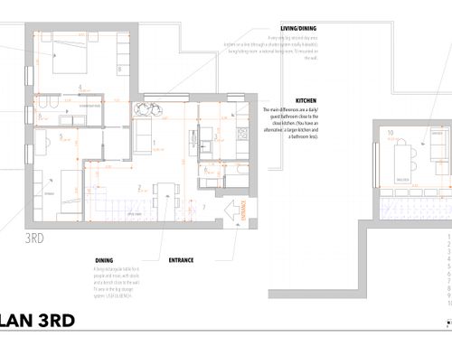 We would like your attention to be directed above all to the living area. The living area must be as comfortable as possible and we would like to be able to close at least part of the kitchen to "hide" any mess if needed.