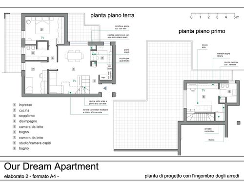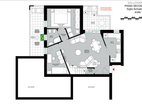 Nella stanza al piano superiore vorremmo mettere una stanza ibrida studio/relax quanto piĂą possibile collegata alla zona giorno al piano inferiore (sarebbe il massimo poterla utilizzare come stanza degli ospiti nel caso ci sia bisogno) e alla grande terrazza attigua che vorremo sfruttare al meglio in estate con i nostri amici e parenti.