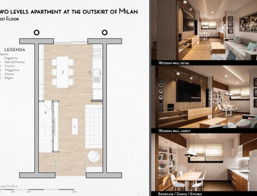 The 65 sqm apartment is on the second level of a 2008 building at outskirt of milan. The main entrance is a glass door on a private balcony. Kitchen and living area are on the first floor, while bedroom, bathroom and a terrace are on the upper floor.