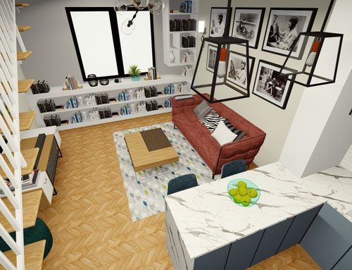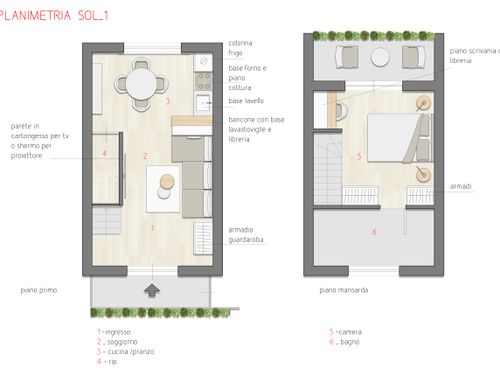 On the first floor I would like to have a kitchen, dining table, sofa, tv screen or wall projector and a small hi-fi system. I have many books, so I would like to find some space to fit them, no matter on which floor.