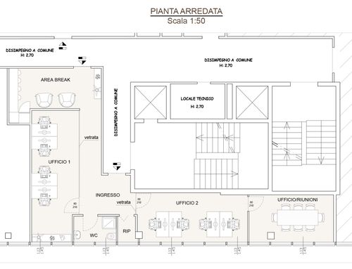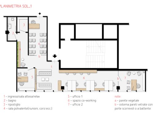 Questi spazi verranno affittati pertanto non so esattamente come è meglio sfruttarli, quindi se ci sta bene una sala riunioni o corsi piuttosto che desk open per coworking, è da decidere.