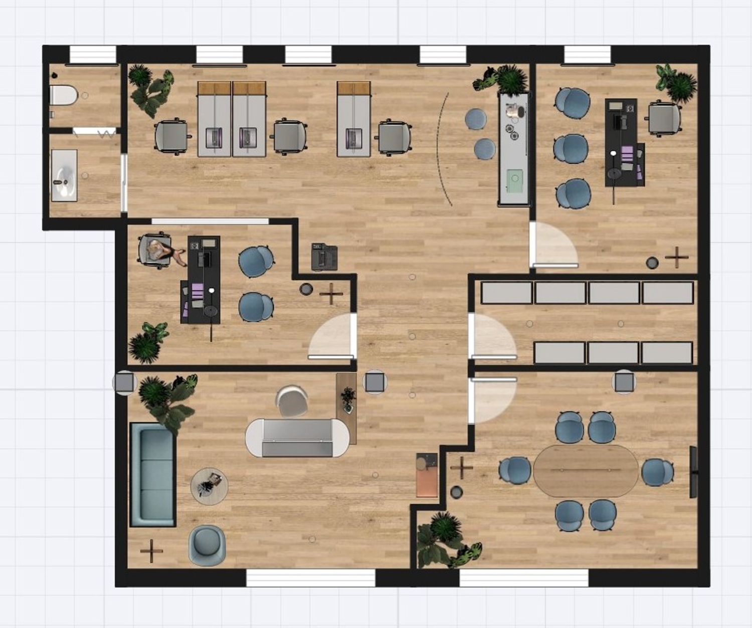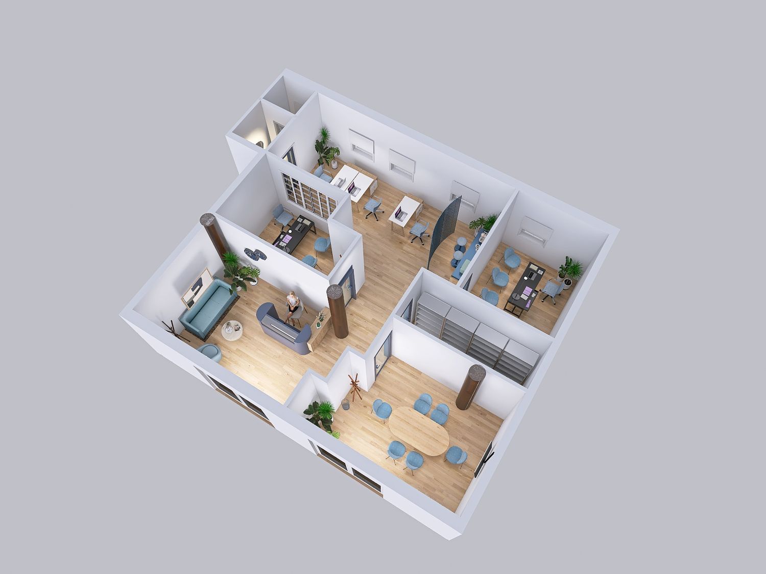 La pavimentazione è realizzata in laminato (es. rovere chiaro), le pareti sono neutre (bianco o avorio), le porte con telaio di colore blu e vetro acidato, le sedie sono con struttura in metallo nero e seduta in tessuto di cotone color azzurro.