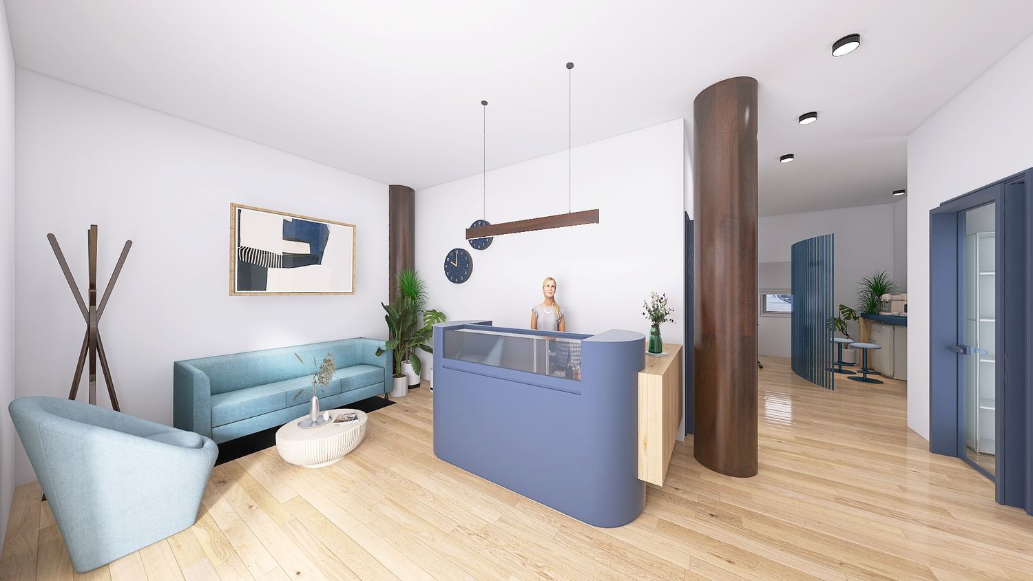 Nella zona reception troviamo un ampio bancone realizzato su misura blu e rovere chiaro ed una piccola sala d’attesa per 3-4 persone con divanetto e poltroncina azzurri.