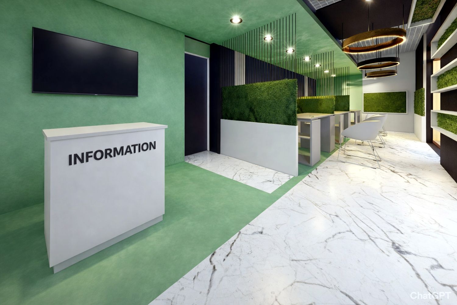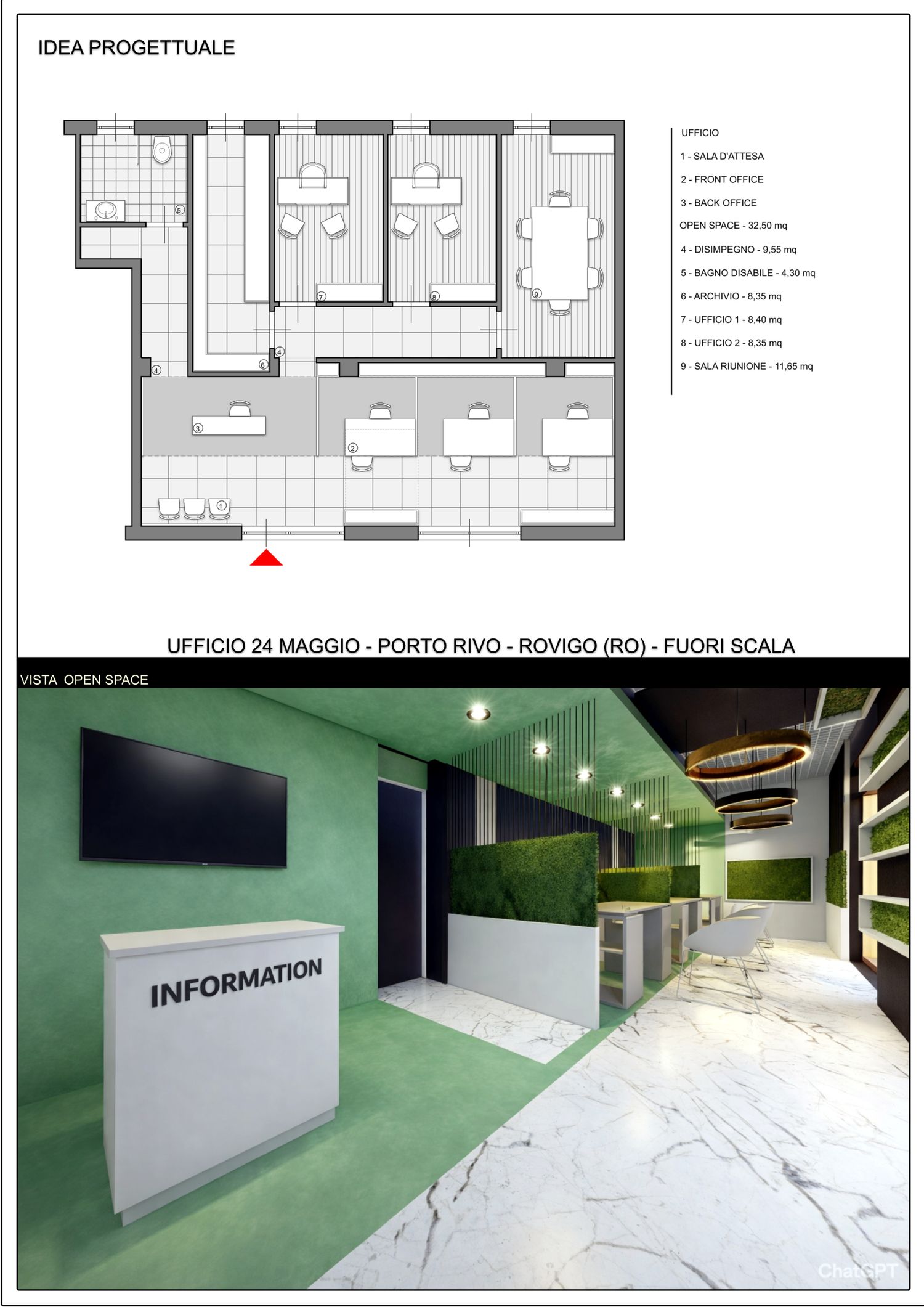 Dalla porta di ingresso si accede direttamente in un grande open space in cui troviamo le tre postazioni separate da verde rampicante, il punto informativo e la sala d’attesa. Le postazioni sono state pensate all’interno di una capsula verde con arredamento nero. Attraverso il primo disimpegno si accede nella zona privata in cui troviamo i 2 uffici dirigenziali, la sala riunione e l’archivio. Dal secondo disimpegno si accede nella zona ripostiglio e nel bagno con dimensioni per garantire l’accesso ad un disabile.