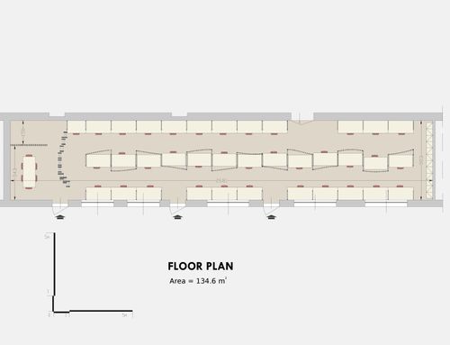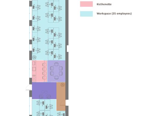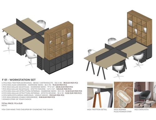 They do not need space to store documents, but space to learn or store the objects they design and / or buy. The environment must be efficient, collaborative, lean, with intelligent space-saving solutions and that easily stays in order. The desks must be equipped with personal cabinets, and have power points scattered everywhere. The windows and walls cannot be changed in size, only renovated and modernized. I would like an open space. Currently the area is an industrial warehouse. The budget is really low, Ikea is the way.