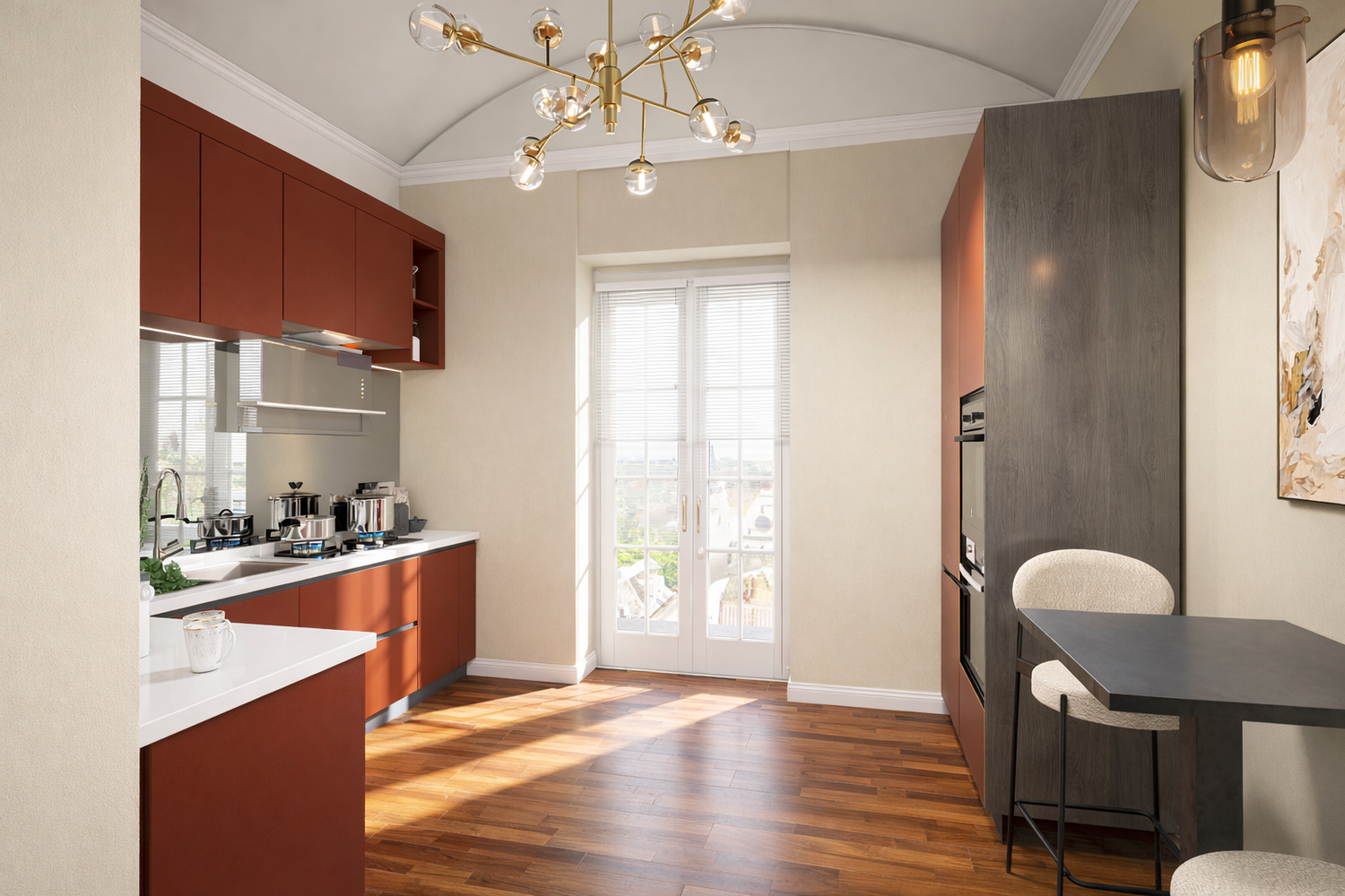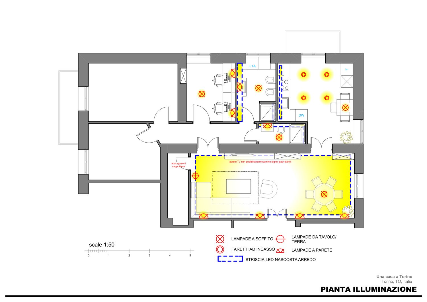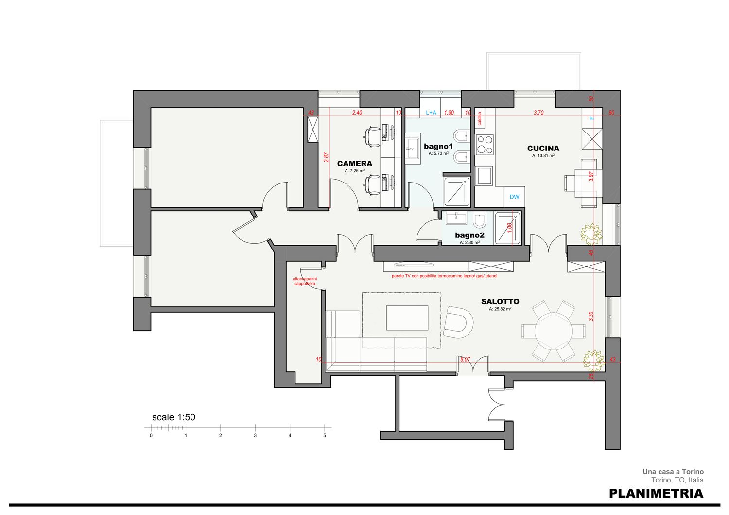 Per quanto riguarda la caldaia, è stata proposta una soluzione di integrazione nel mobilio della cucina; qualora non fosse tecnicamente realizzabile, è prevista la permanenza nella posizione attuale, mascherata tramite una boiserie decorativa. La cucina è pensata per funzionare completamente a induzione, senza necessità di gas.
