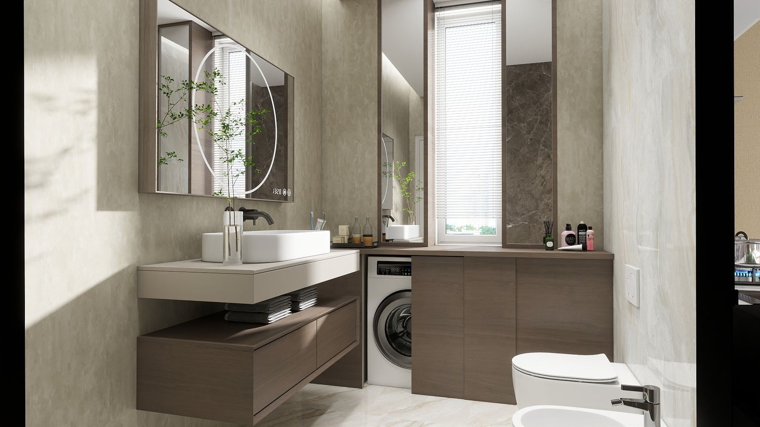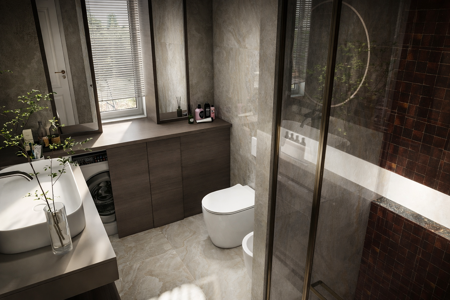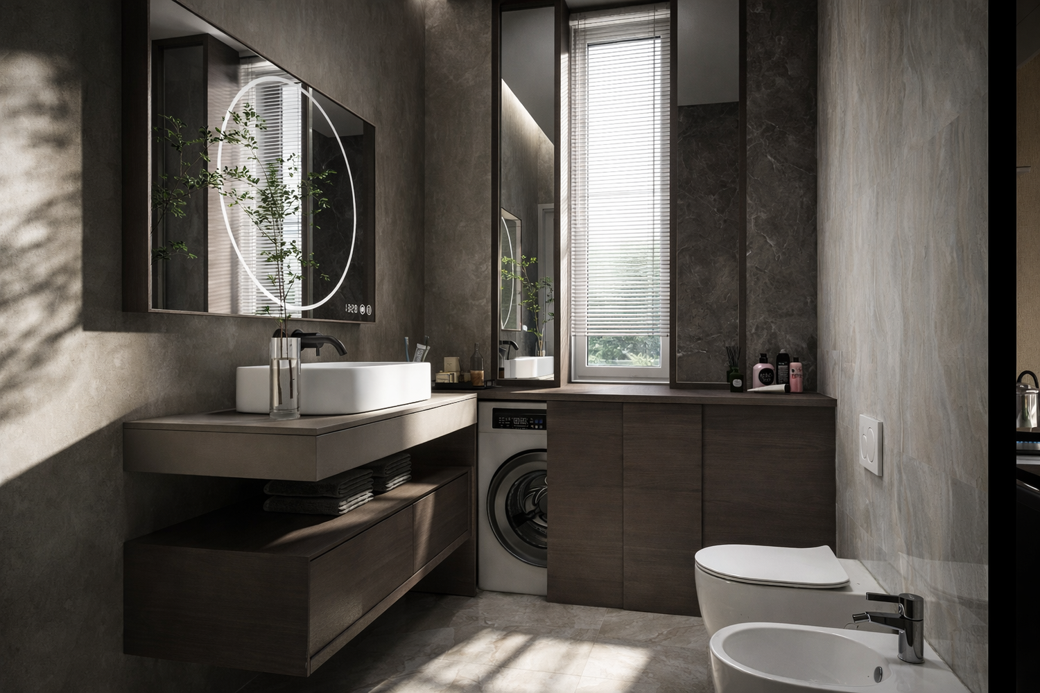 Nel bagno principale è stata integrata la zona lavanderia sotto la finestra, sfruttando una nicchia esistente; sono inoltre previsti ampi spazi contenitivi integrati, progettati per non alterare il linguaggio architettonico. Il bagno più piccolo è ottimizzato con l’inserimento di un WC con bidet integrato.