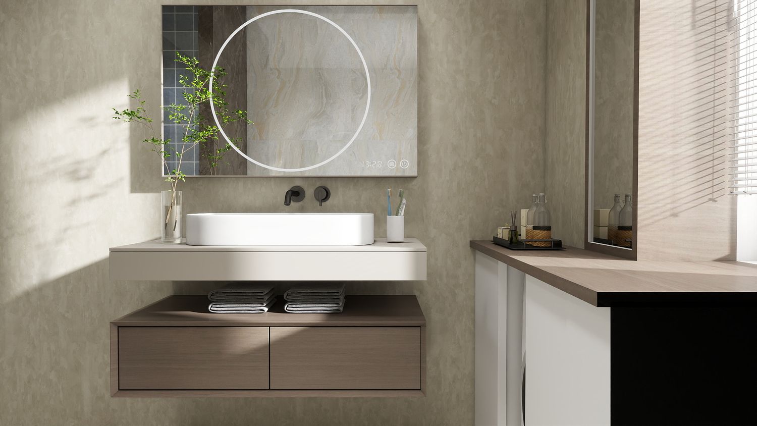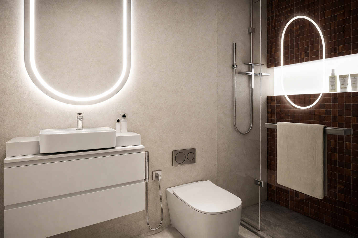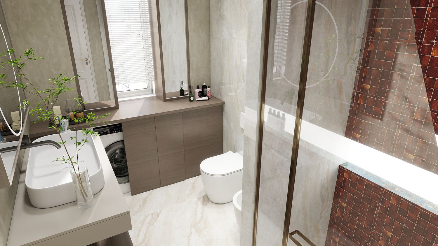 Nel bagno principale è stata integrata la zona lavanderia sotto la finestra, sfruttando una nicchia esistente; sono inoltre previsti ampi spazi contenitivi integrati, progettati per non alterare il linguaggio architettonico. Il bagno più piccolo è ottimizzato con l’inserimento di un WC con bidet integrato.