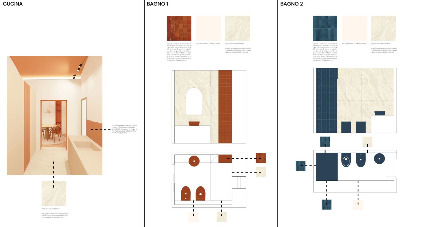 Dalla cucina si accede alla zona lavanderia e al bagno principale. L’accesso è mascherato utilizzando le stesse ante della cucina, ma di colore terracotta, in modo da garantire una continuità spaziale e visiva. Allo stesso tempo, il colore consente di rendere immediatamente riconoscibile l’ingresso alla lavanderia.