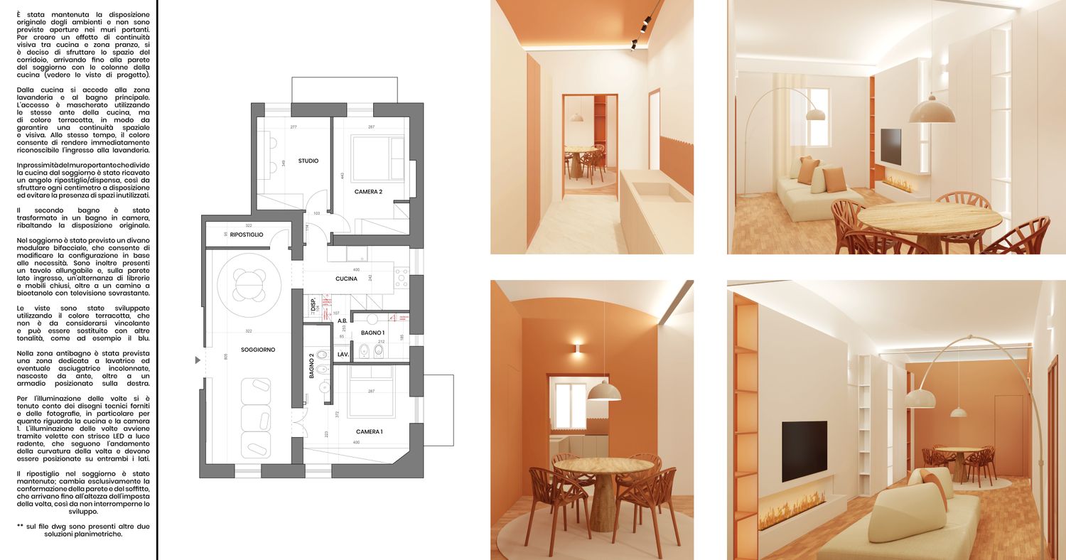 Il ripostiglio nel soggiorno è stato mantenuto; cambia esclusivamente la conformazione della parete e del soffitto, che arrivano fino all’altezza dell’imposta della volta, così da non interromperne lo sviluppo.