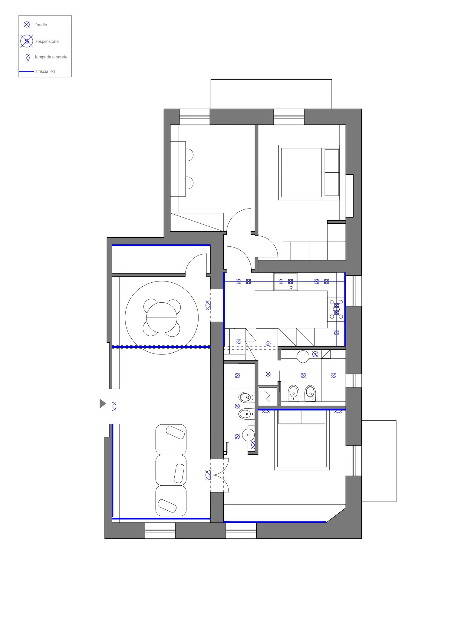 Per l’illuminazione delle volte si è tenuto conto dei disegni tecnici forniti e delle fotografie, in particolare per quanto riguarda la cucina e la camera 1. L’illuminazione delle volte avviene tramite velette con strisce LED a luce radente, che seguono l’andamento della curvatura della volta e devono essere posizionate su entrambi i lati.