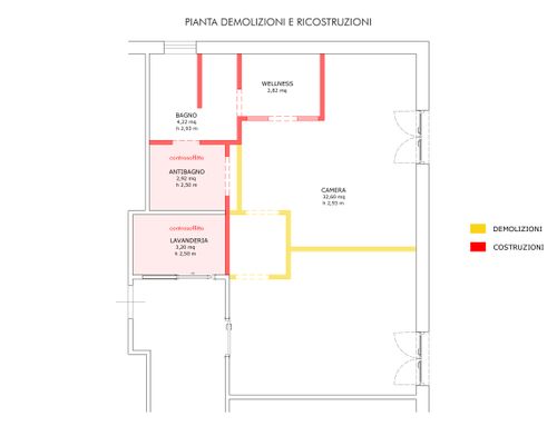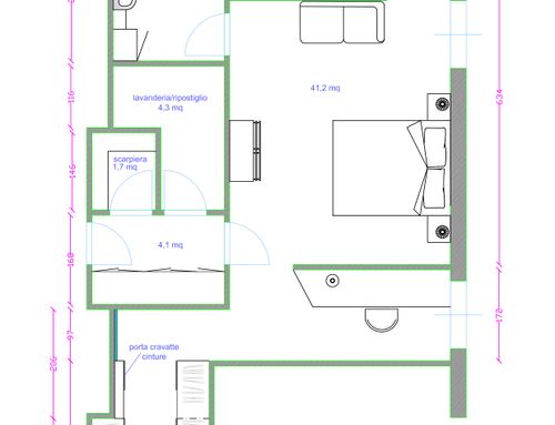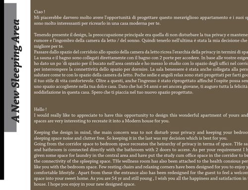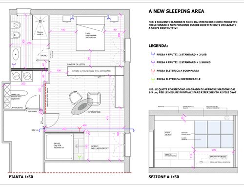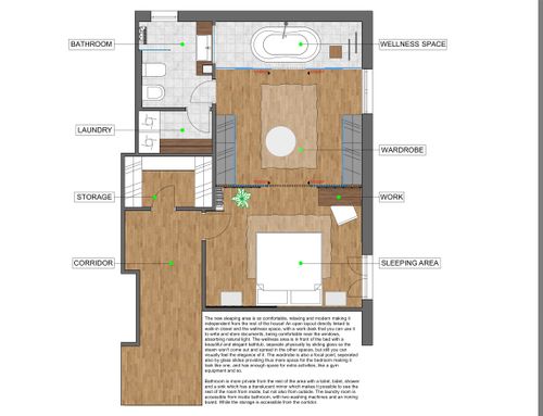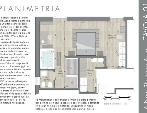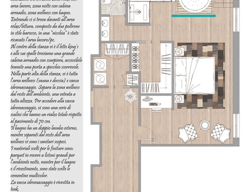 Il desiderio è quello di avere una zona notte che sia un open space confortevole, riposante, moderno, isolato dall'esterno e "autosufficiente". Dall'interno dell'open space sarà possibile usufruire dei servizi igienici o dello spazio wellness oppure dedicarsi al lavoro con un piccolo angolo per scrivere e tenere documenti. Inoltre si rende necessario ricavare un piccolo stanzino lavanderia accessibile NON dalla zona notte ma dal corridoio. Lo stile preferito della zona servizi e wellness è moderno, naturale e MATERICO. La zona servizi la si preferisce minimal e nascosta mentre la zona wellness la si preferisce visibile ma ben separata (magari da un vetro al fine di evitare il propagarsi e il disperdersi dei vapori) dal resto della zona notte.