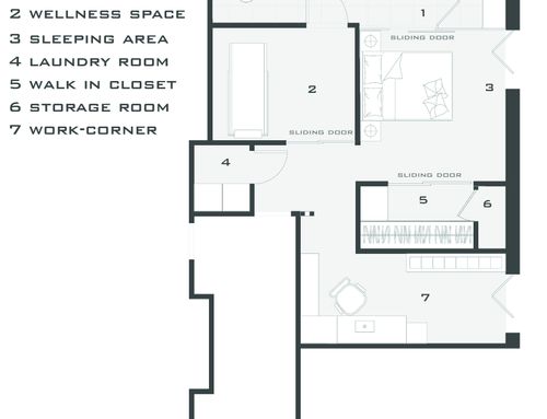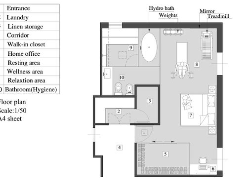 I'd like the sleeping area and bathroom to be minimal and the wellness area to be in plain sight but separated from the rest of the sleeping area. You could use a glass door to separate it so the steam won't go out and spread in the other rooms.