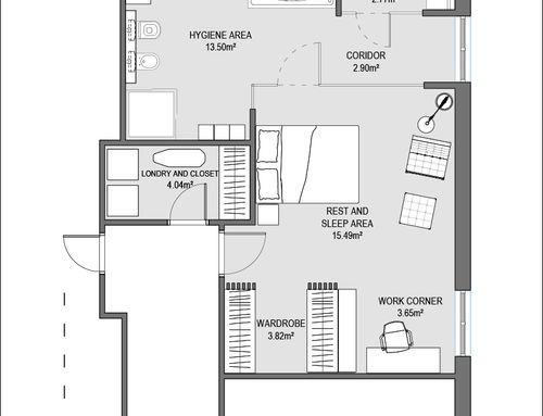 I'd like to have an open space directly linked to the bathroom and the wellness space and with a work-corner that I will use to write and store documents.