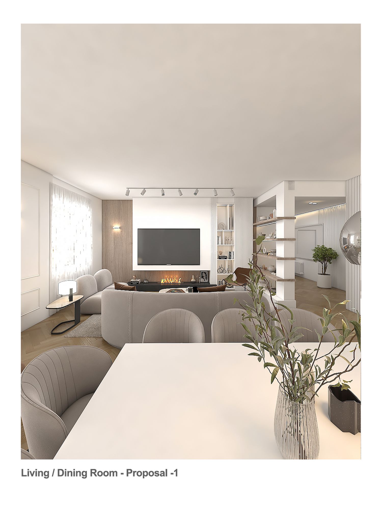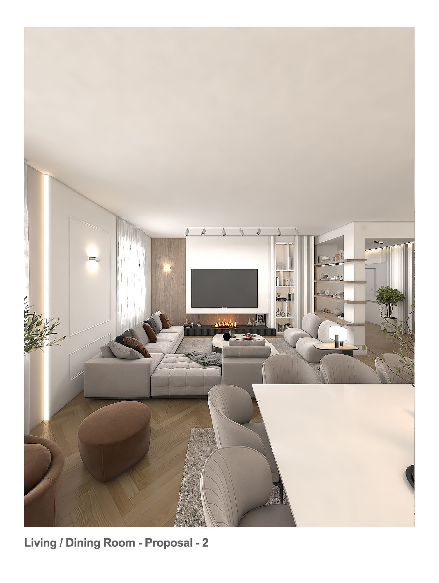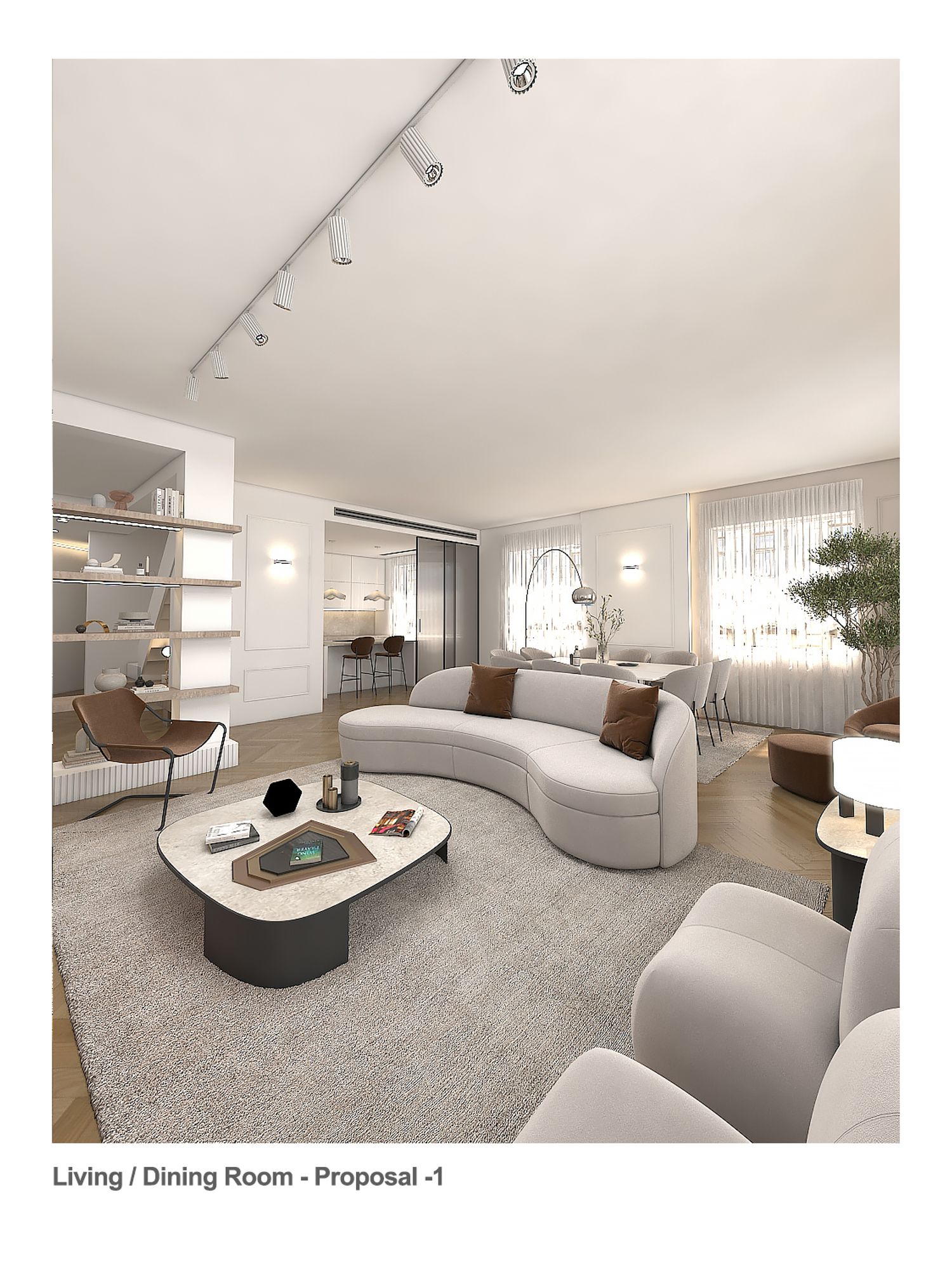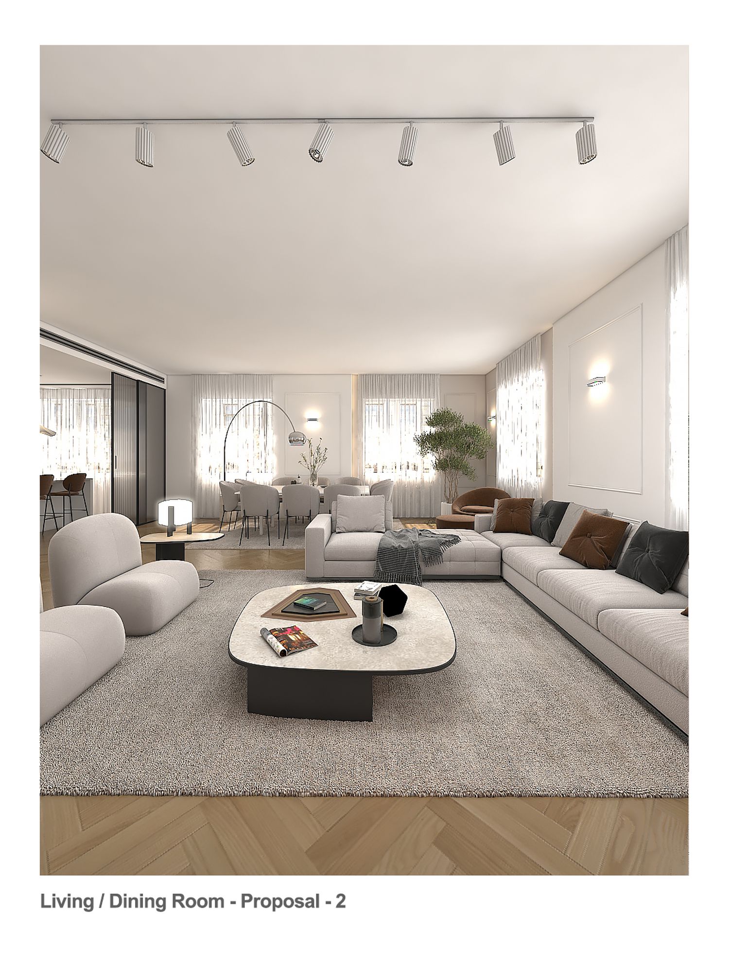 Two styles of furniture are suggested for the living room and the dining table is the same as your current one.