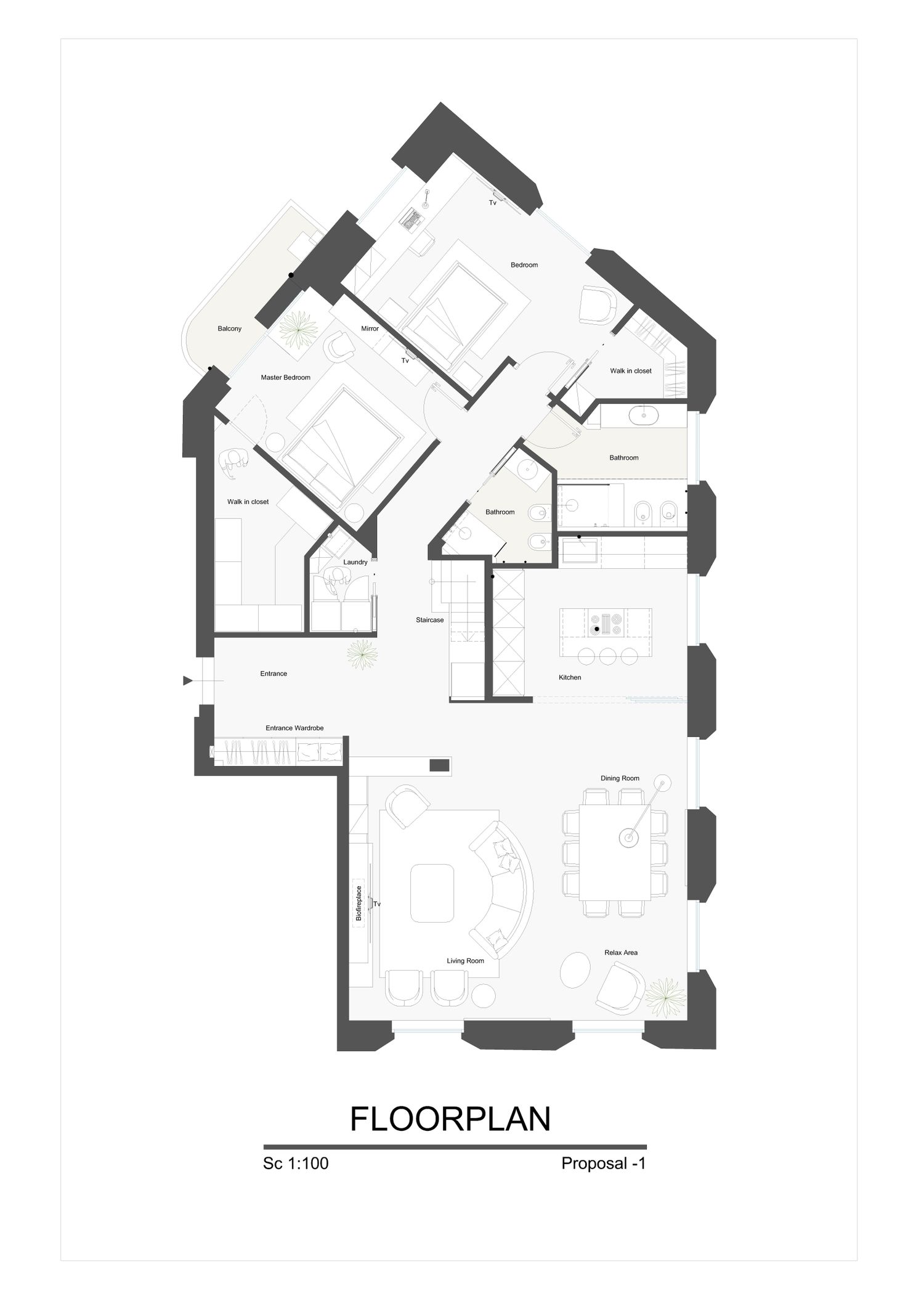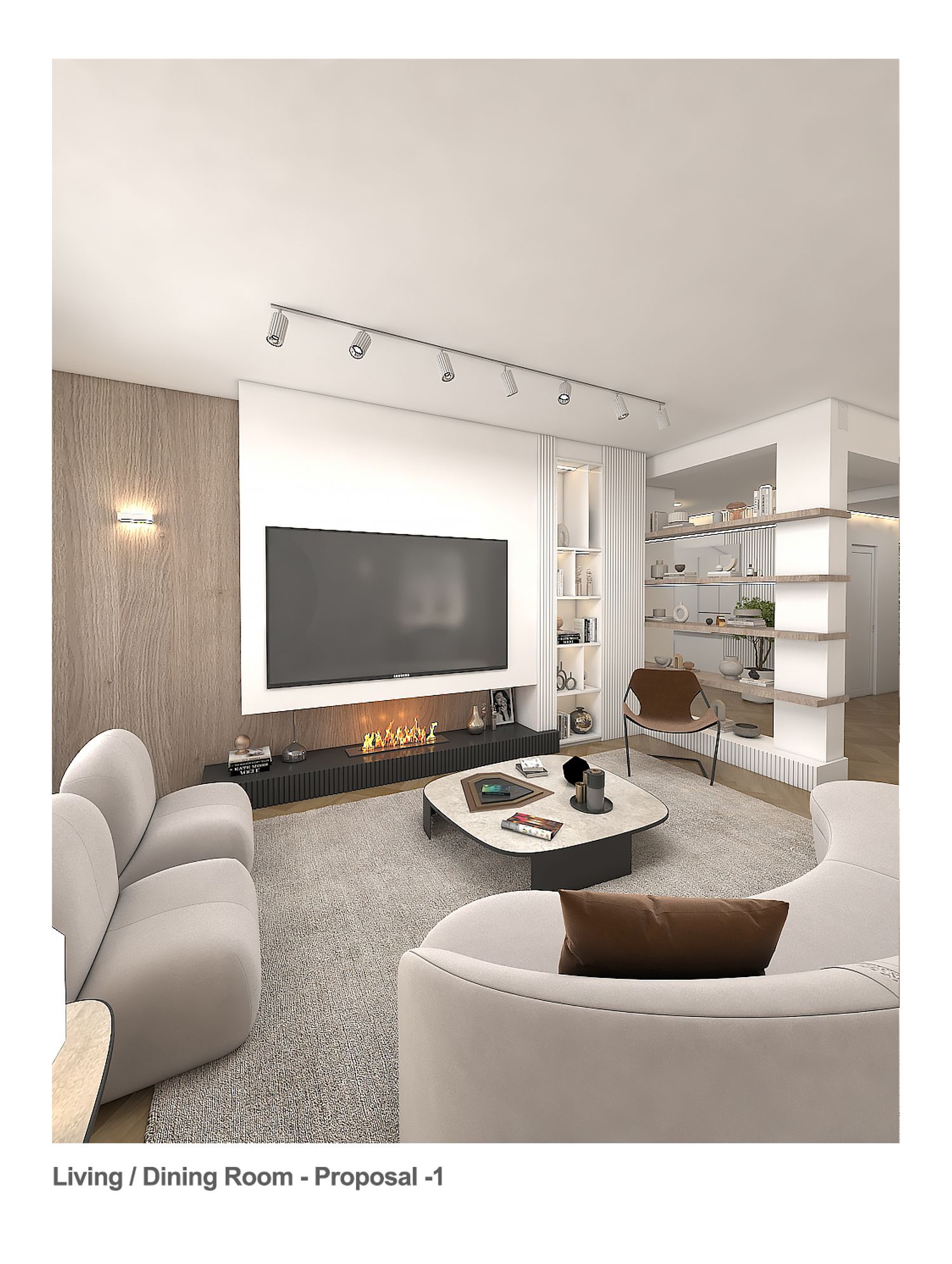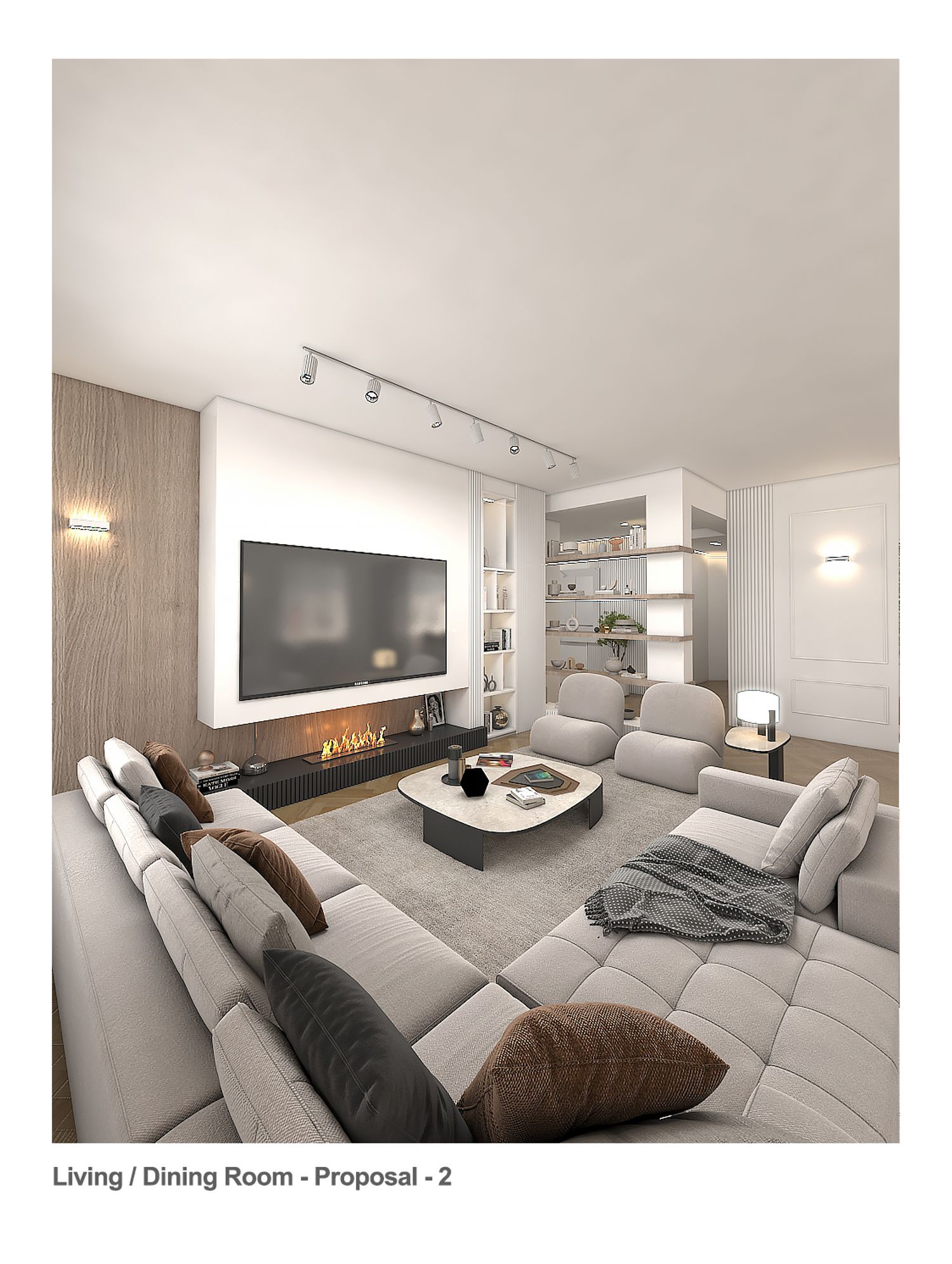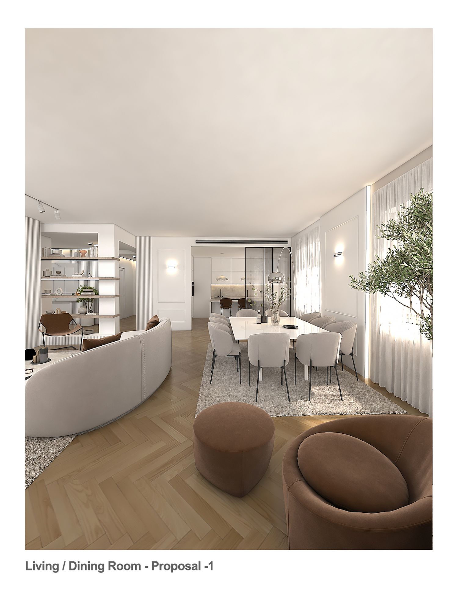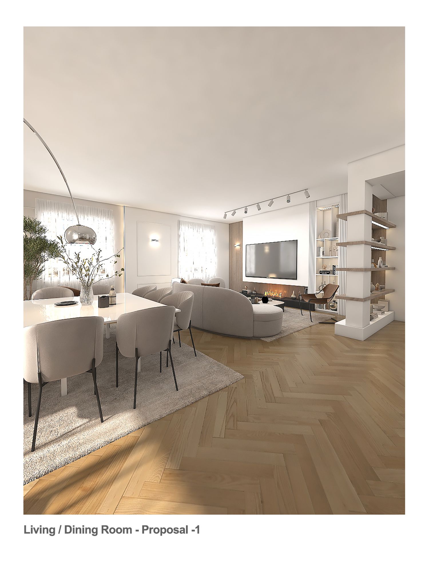 Two styles of furniture are suggested for the living room and the dining table is the same as your current one.