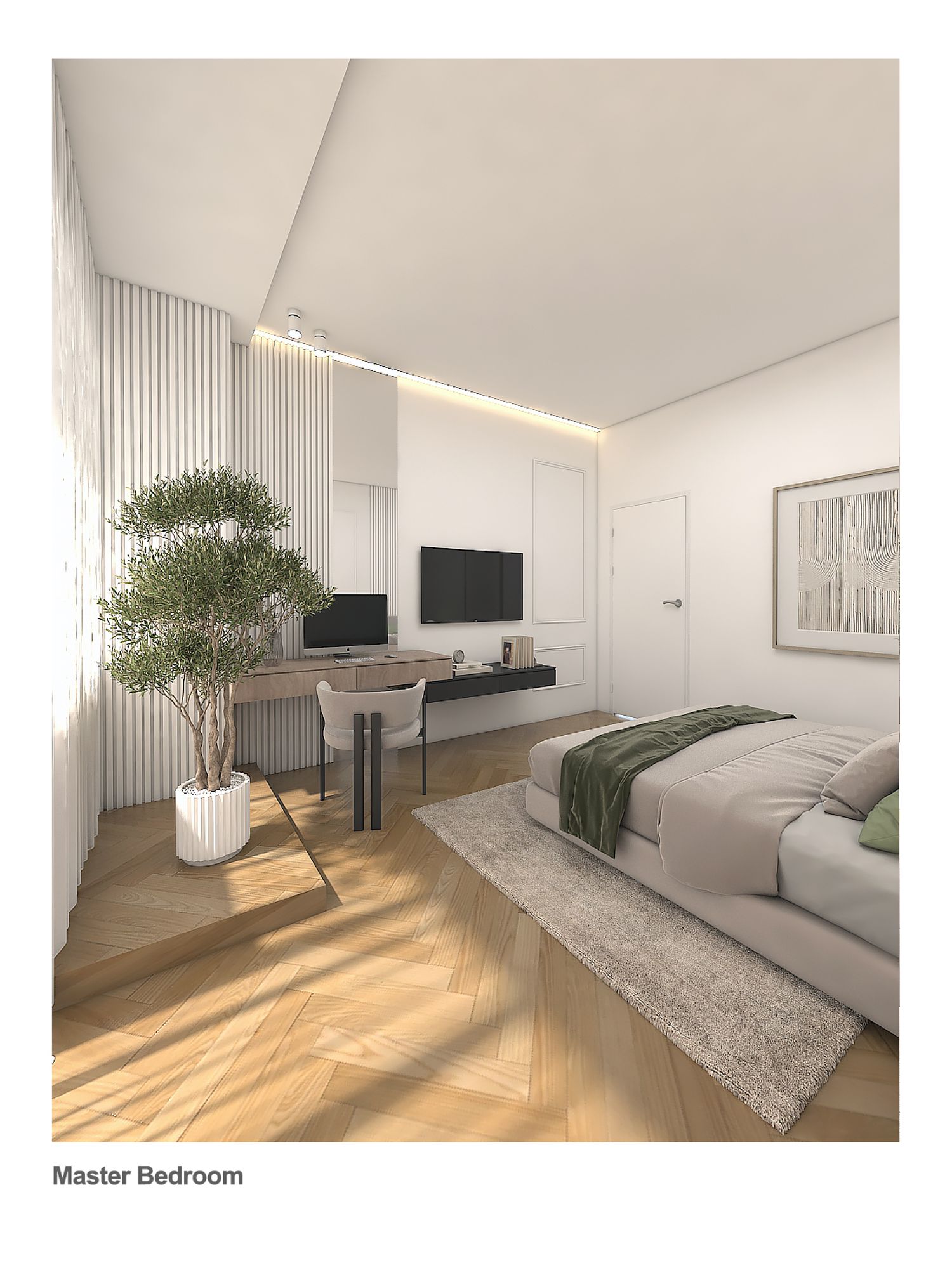 The combination of white and cream colors along with the soft wood texture creates an eye-catching space away from visual clutter.