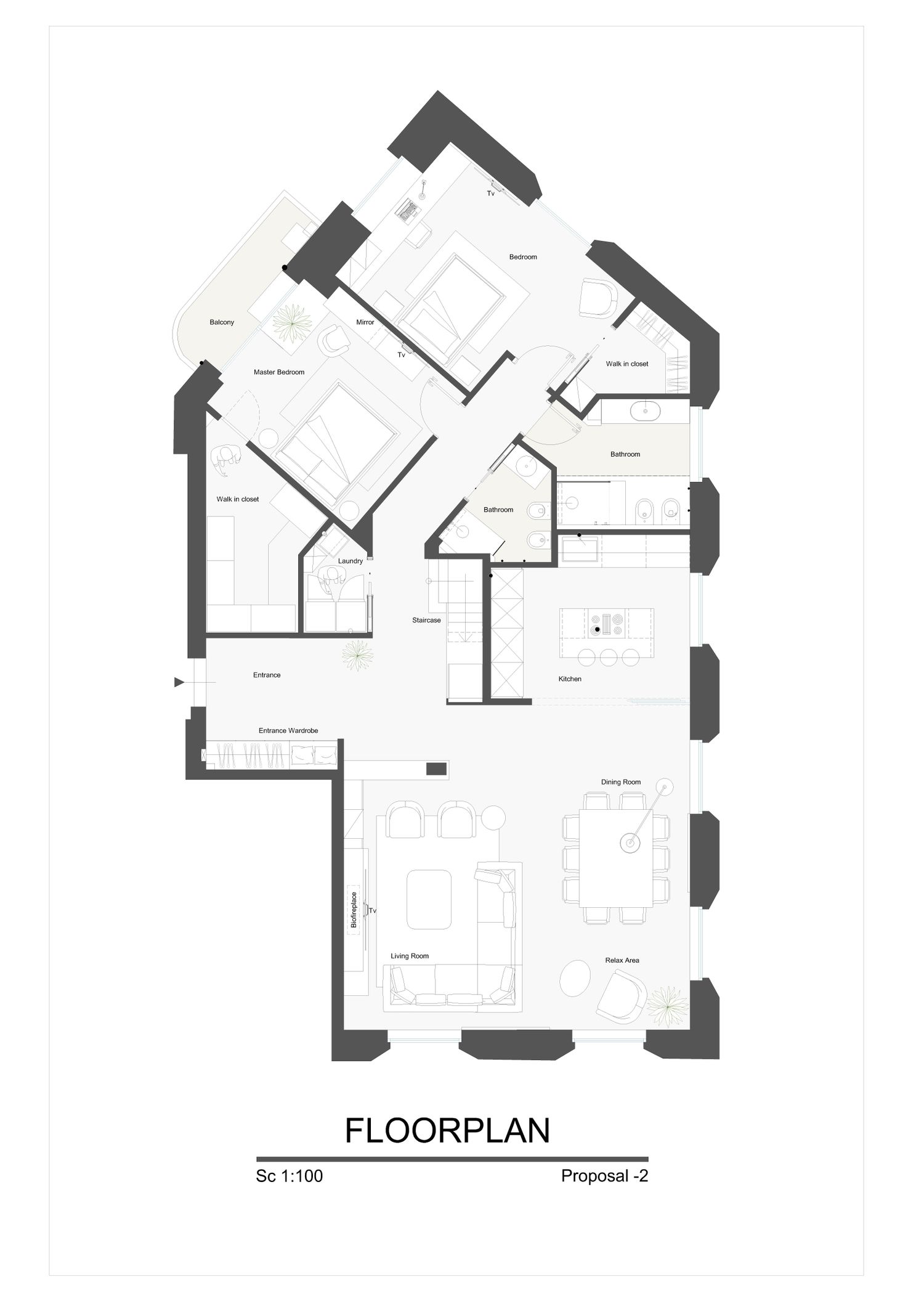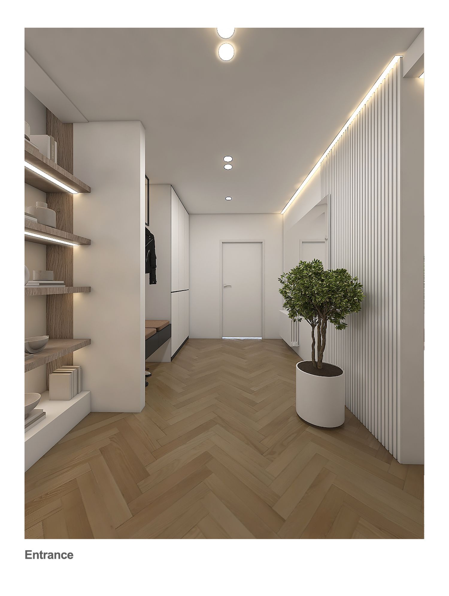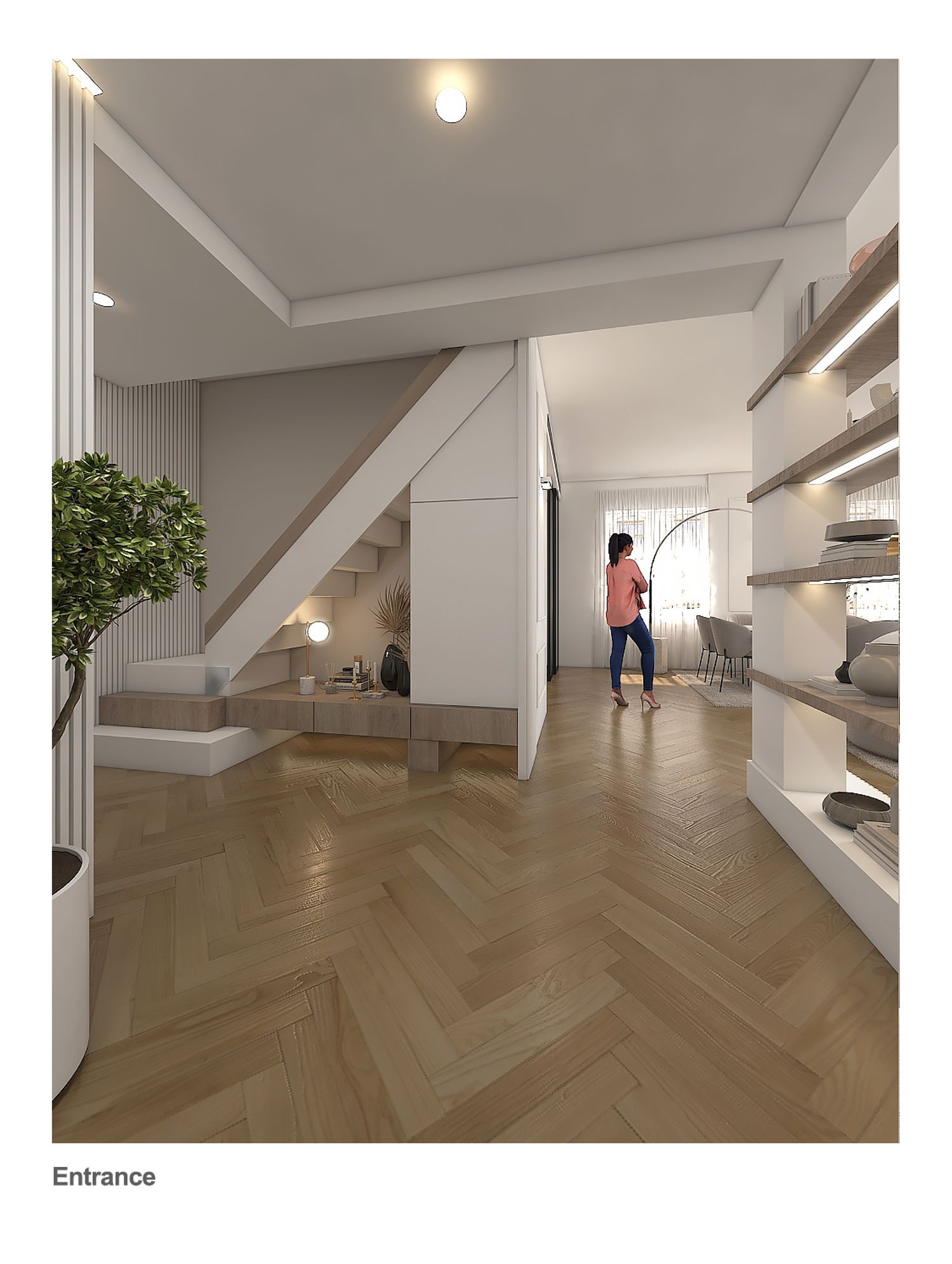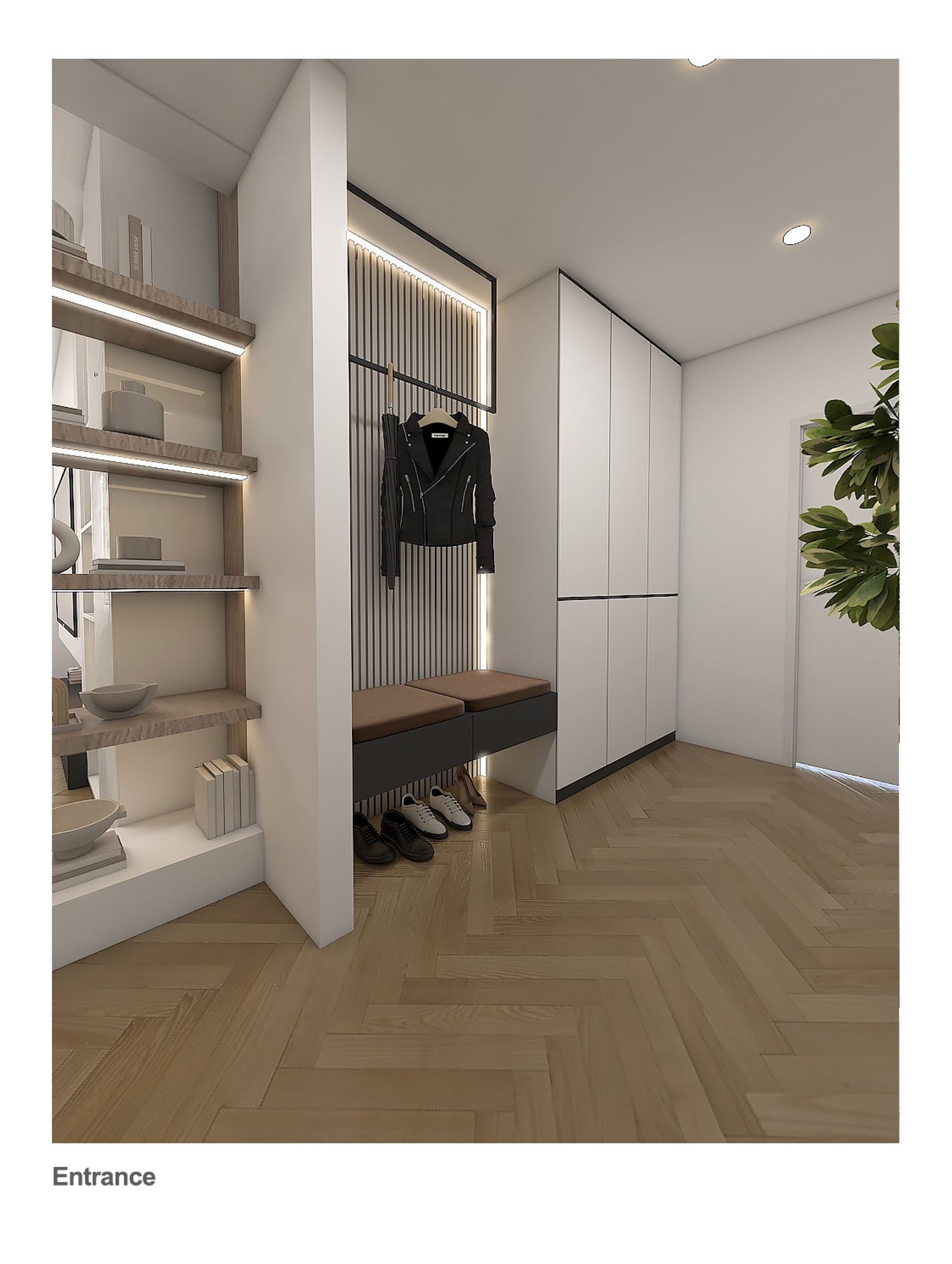A closet is planned under the stairs as a place to store additional accessories, which is combined with a decorative design made of wood that is in harmony with the decorative elements next to the column.