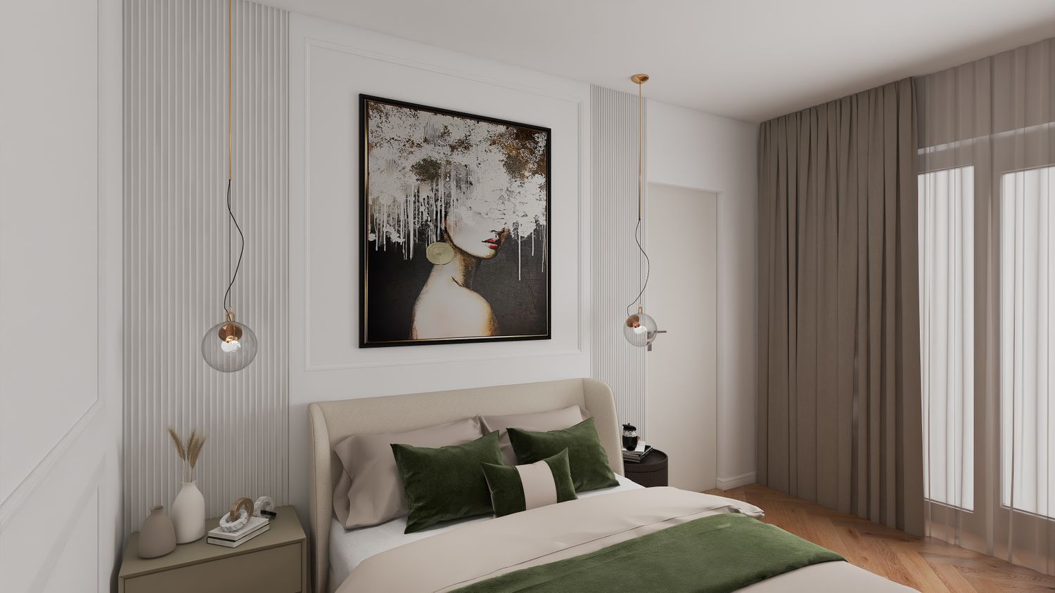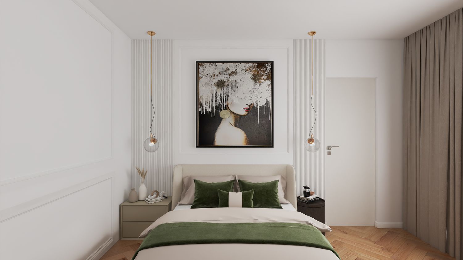 La camera padronale è caratterizzata da una parete del letto con boiserie e pannelli doghettati.