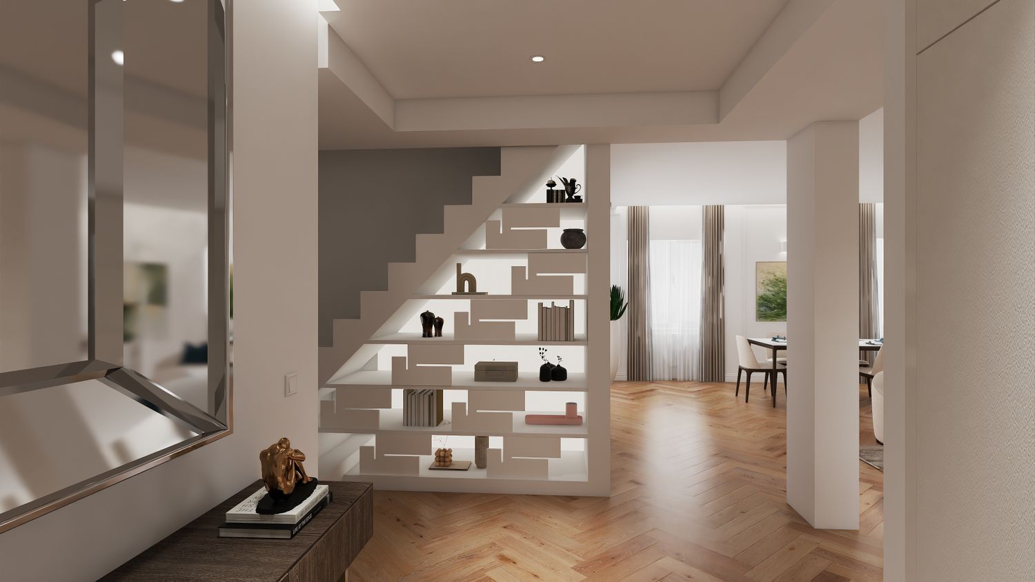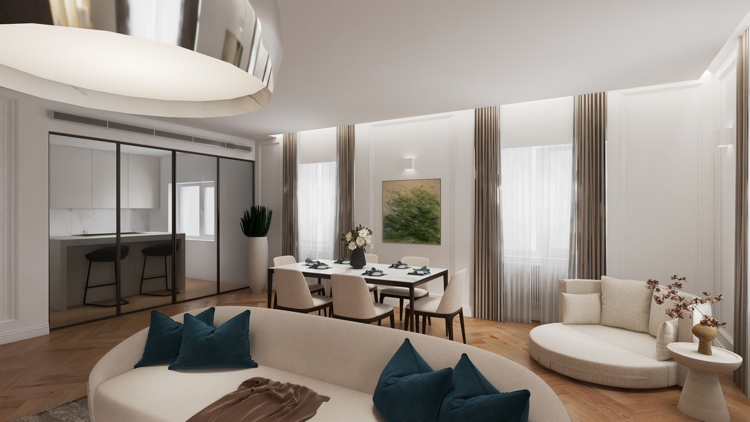 in base alle Sue richieste, ho sviluppato una proposta per il Suo progetto ispirata a uno stile classico contemporaneo, caratterizzato da linee pulite, toni caldi e dal mantenimento del bianco alle pareti dell’abitazione.