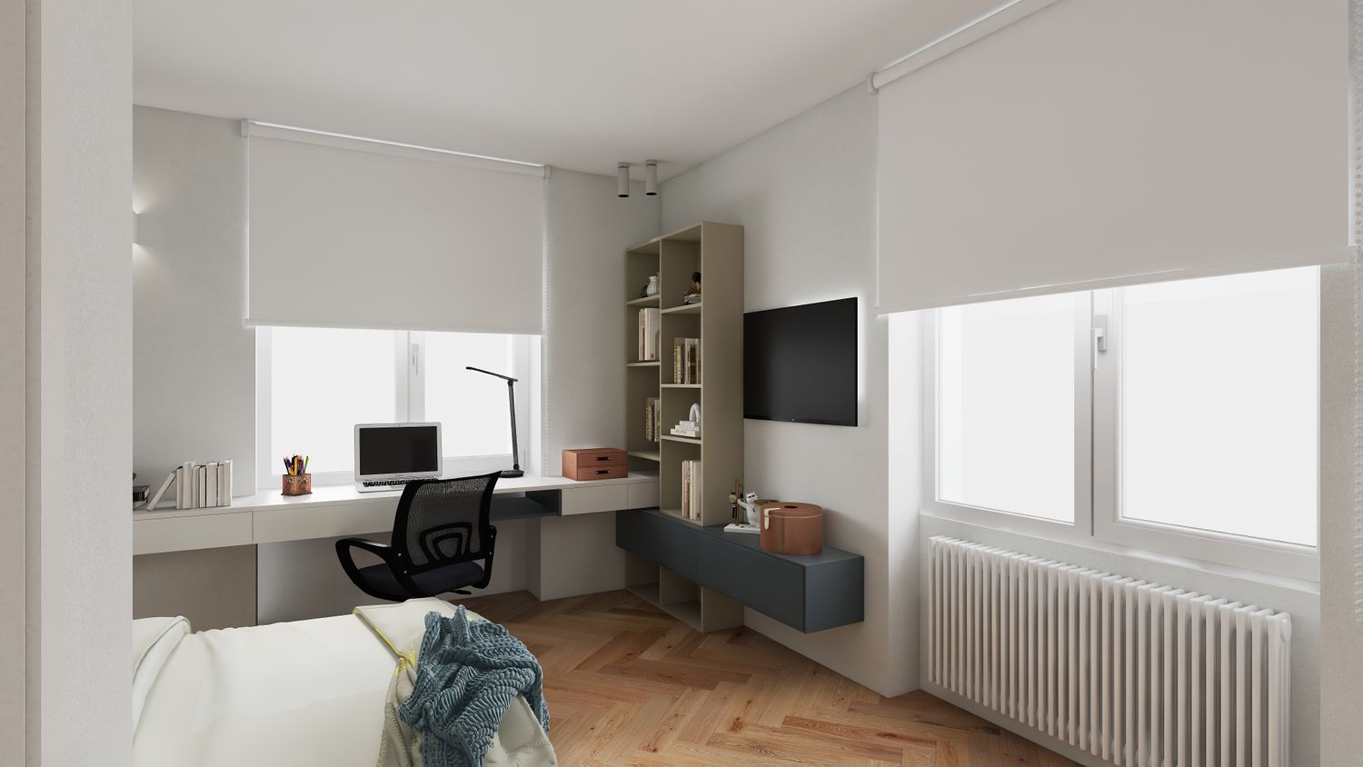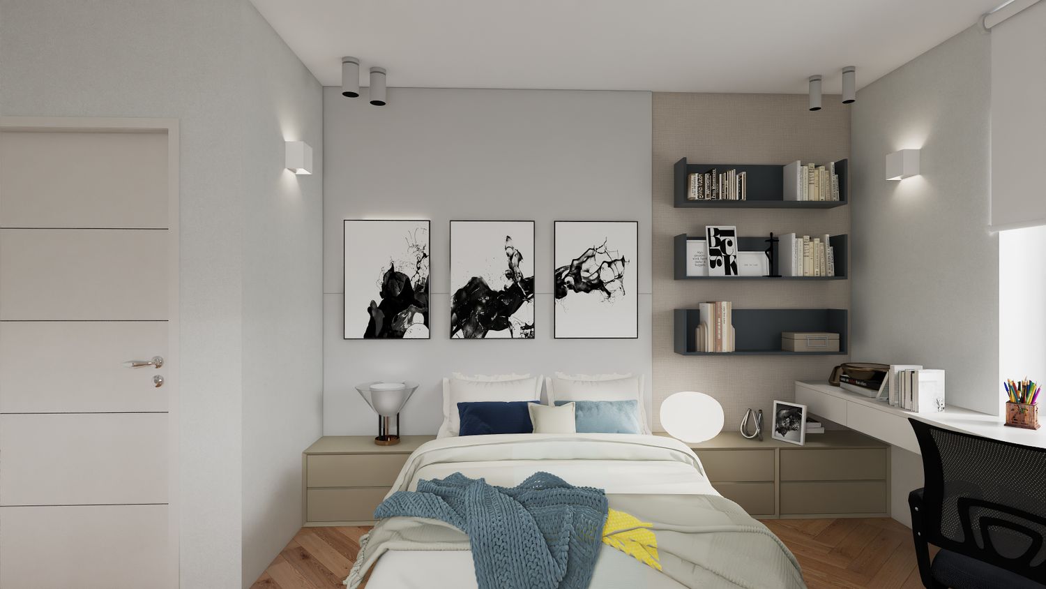 La stanza del ragazzo presenta una testata del letto composta da due pannelli che delimitano la zona notte e una carta da parati effetto tessuto, sulla quale sono collocate mensole a U.
