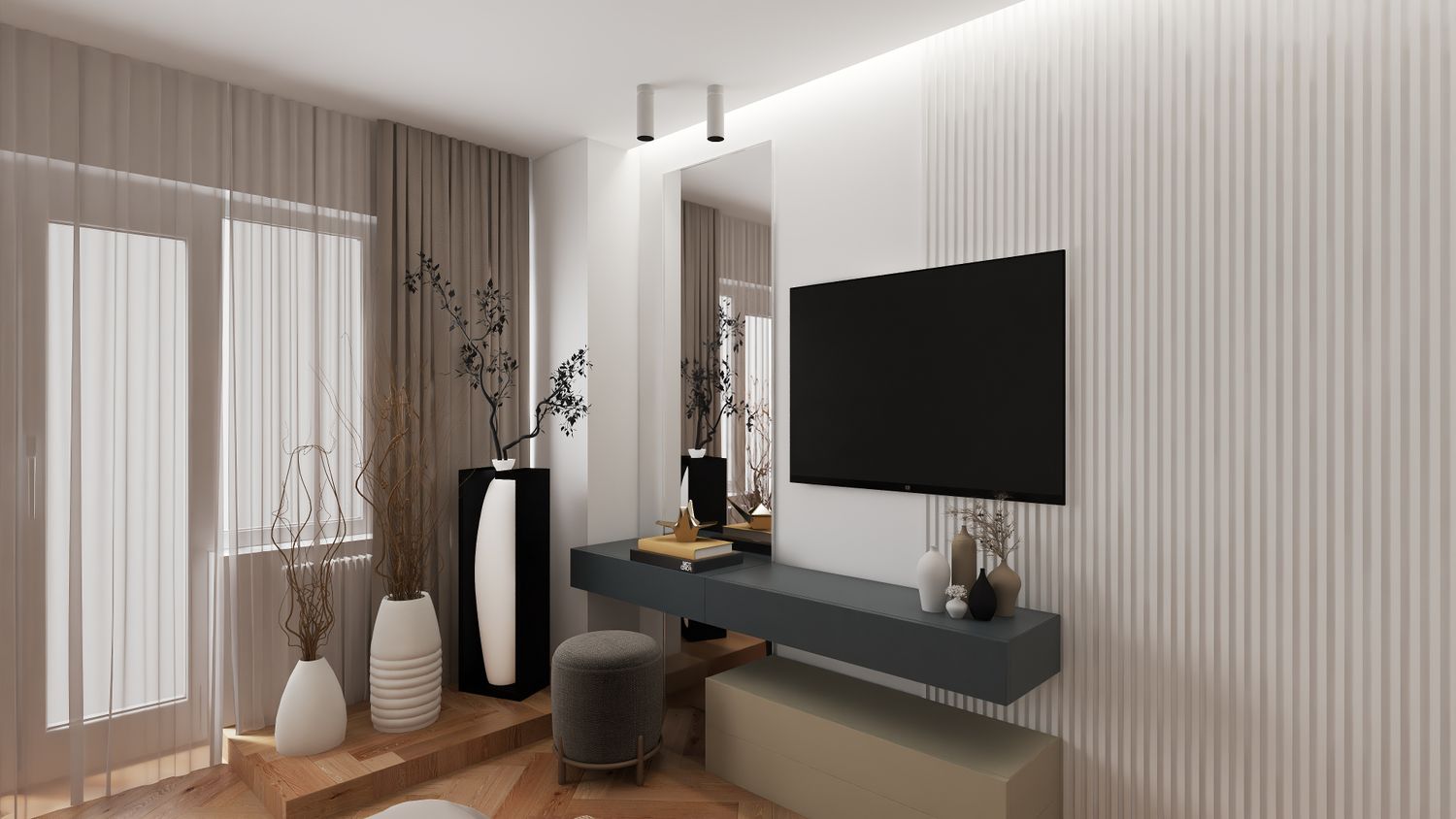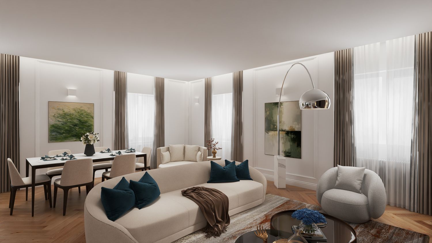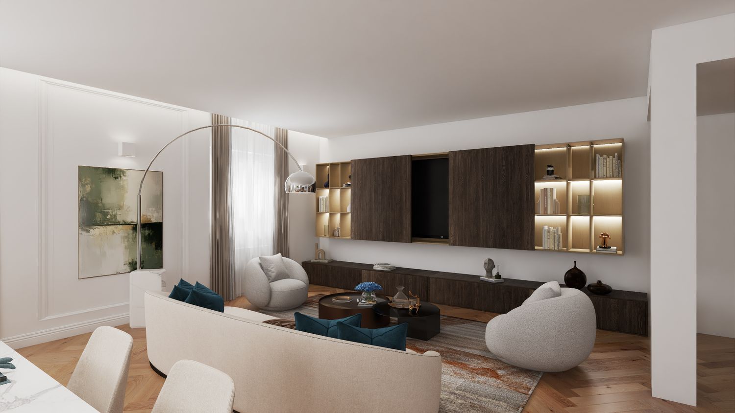 L’area giorno si articola in una zona conversazione e TV, con un divano color bianco panna dalle dimensioni generose e due poltroncine grigio chiaro. Nell’angolo tra divano e poltrona è prevista la lampada ad arco di Flos.