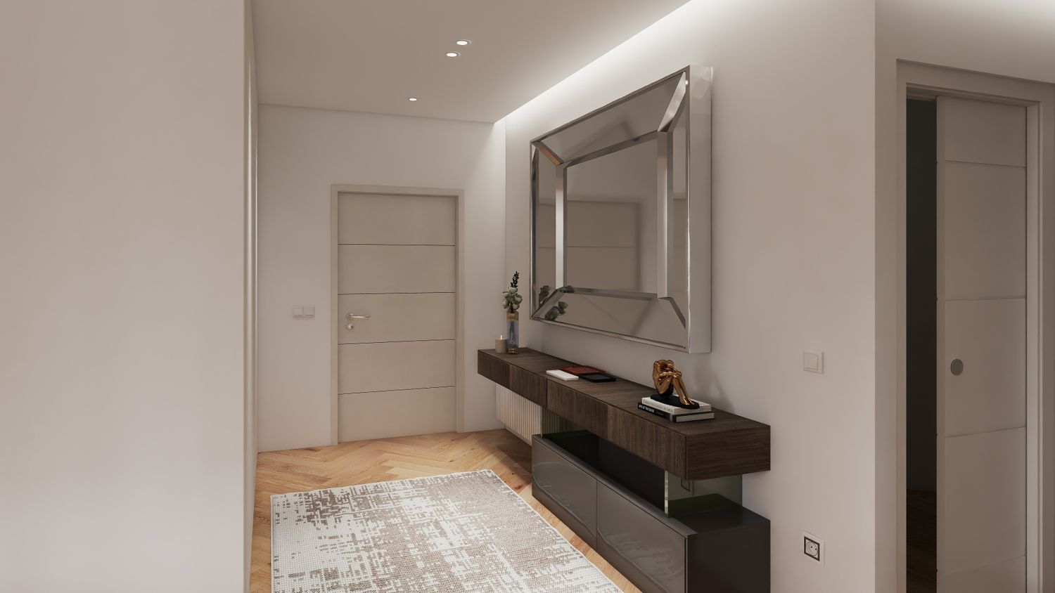 Per l’ingresso ho previsto un mobile della linea Lago, che si abbina armoniosamente allo specchio già presente.