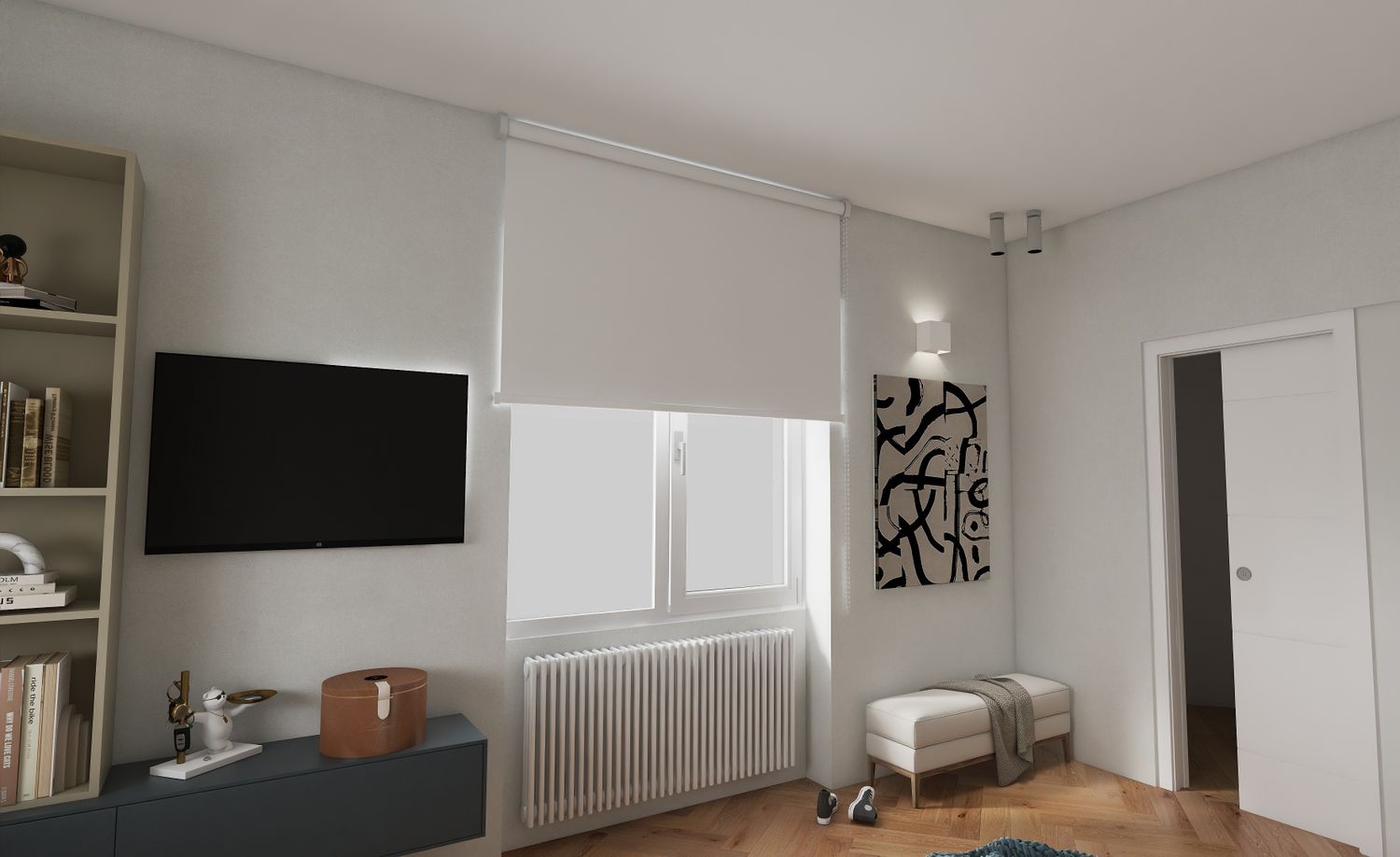 La parete attrezzata, realizzata su misura, comprende tre moduli affiancati, di cui quello centrale ospita la TV a scomparsa grazie a due pannelli scorrevoli che, in apertura, si sovrappongono alle librerie laterali. La base include un contenitore a ribalta.