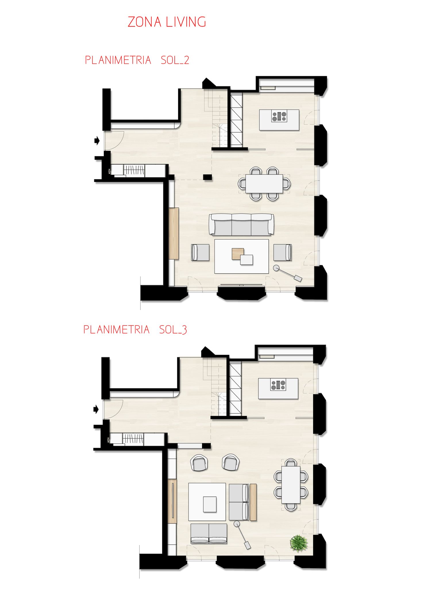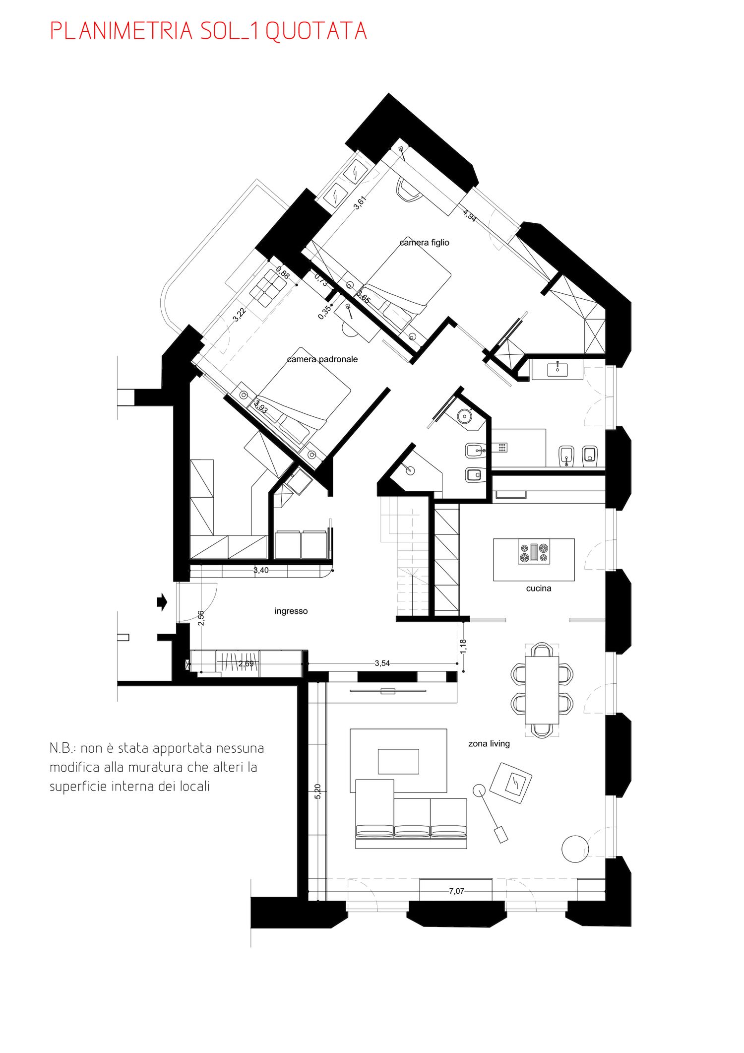 home, involving only interior design interventions, adding a touch of style and functionality that complements the existing renovations. Particular attention was paid to the living area, with the entrance redesigned to provide an attractive visual link throughout the apartment. This area features comfortable flush-to-the-wall wardrobes that blend seamlessly into the space, leading to the living room, designed with multiple internal layout options. Wood paneling was also added to enhance the welcoming feel and make the rooms feel warmer. Furthermore, as shown in the floor plans and attached drawings, the sleeping area now offers more space and furnishings that complement the interiors.