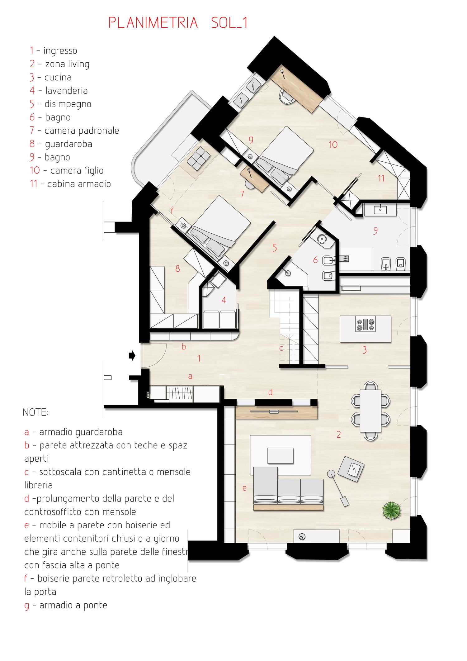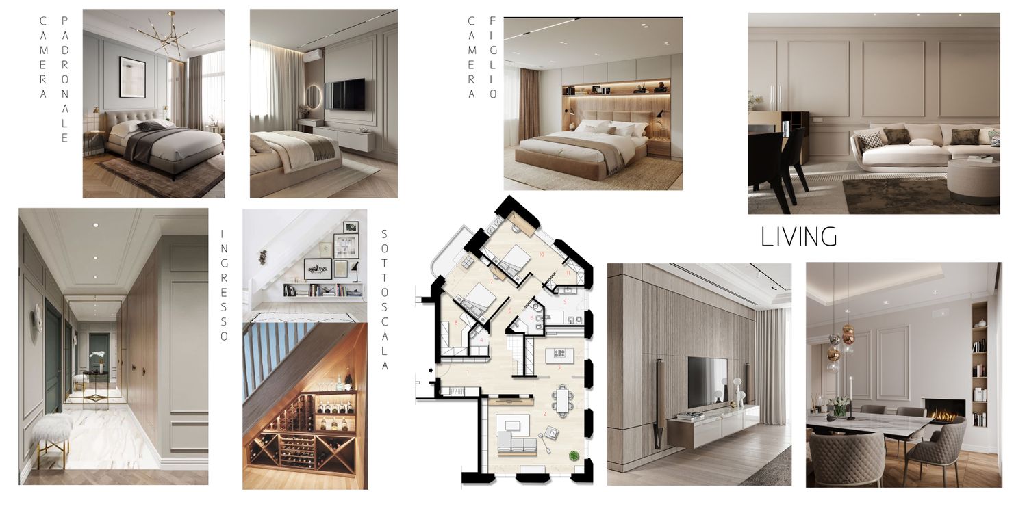 Il progetto consiste in una rifunzionalizzazione interna della casa che prevede interventi solo per quanto riguarda l’interior design andando a dare un nuovo tocco di stile e funzionalità che ben si coniuga con gli interventi già realizzati. Particolare attenzione è stata rivolta alla zona giorno con l’ingresso rivisto in modo da offrire un filtro accattivante per l’intero appartamento, qui trovano spazio comode armadiature filo muro che ben si integrano nel contesto per poi giungere nel living studiato in più opzioni di distribuzione interna. Sono inoltre state inserite boiserie per dare un maggiore senso di accoglienza e rendere così gli ambienti più caldi. Inoltre la zona notte come visibile dalle planimetrie e dalle tavole allegate offre ora maggiori spazi e arredi che vanno a completare gli spazi interni.